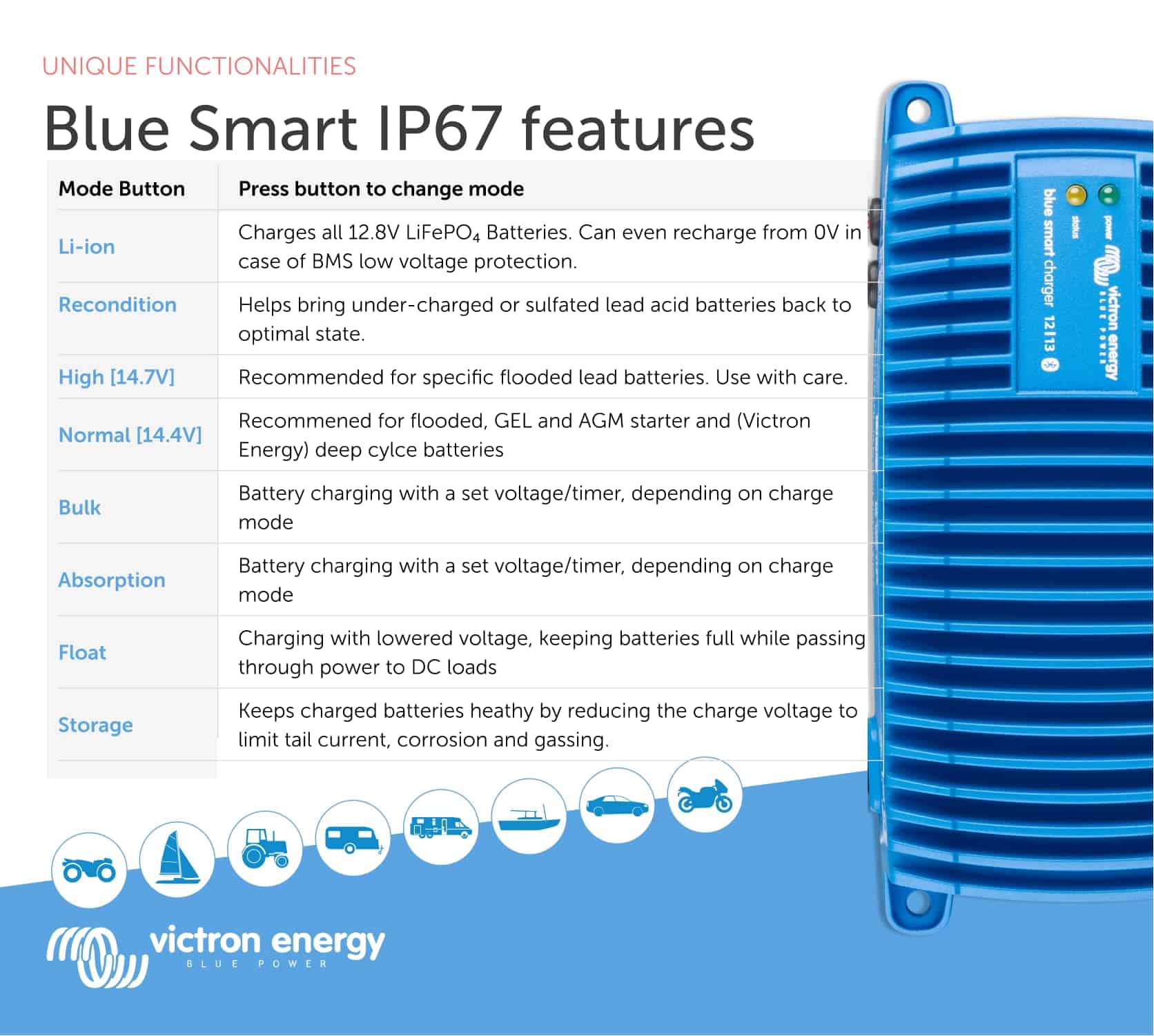 El Cargador de Batería Victron Energy Blue Smart IP67 Waterproof es el nuevo cargador de batería profesional con bluetooth incorporado. Puede ser utilizado en dispositivos en su taller y en vehículos motorizados como autos (clásicos), motocicletas, lanchas y camperas.