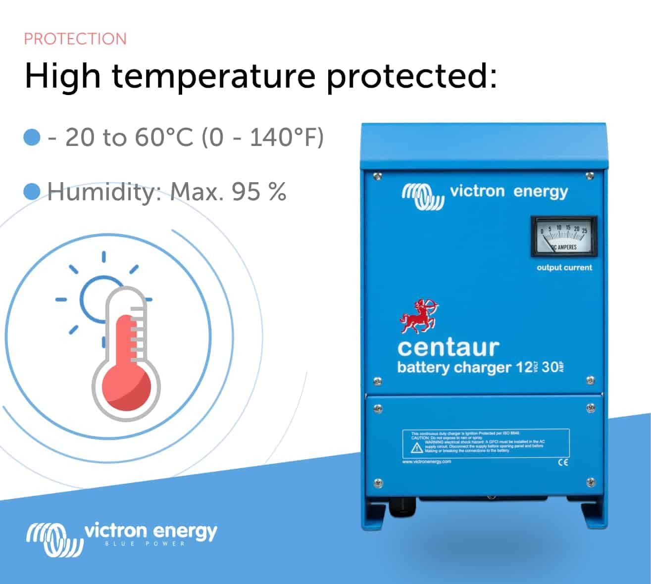 La gama de cargadores de batería Victron Energy Centaur cuenta con una entrada de auto-rango que cubre 90-265VAC 50/60Hz, lo que significa que se pueden utilizar en cualquier parte del mundo. Crucialmente, y a diferencia de muchos otros productos que afirman tener una entrada universal, la gama Victron Energy Centaur mantendrá la potencia de salida completa en todo el rango especificado. Otras características incluyen una característica de carga de tres etapas completamente automática que garantiza que las baterías estén completamente cargadas en todo momento y tres salidas de carga aisladas para configuraciones de múltiples baterías que se adaptan a la mayoría de las instalaciones típicas. La gama abarca modelos de 12V y 24V, desde 16A hasta 100A.