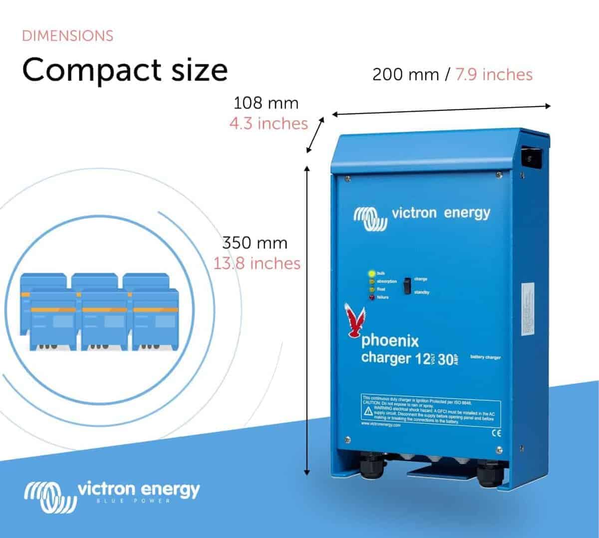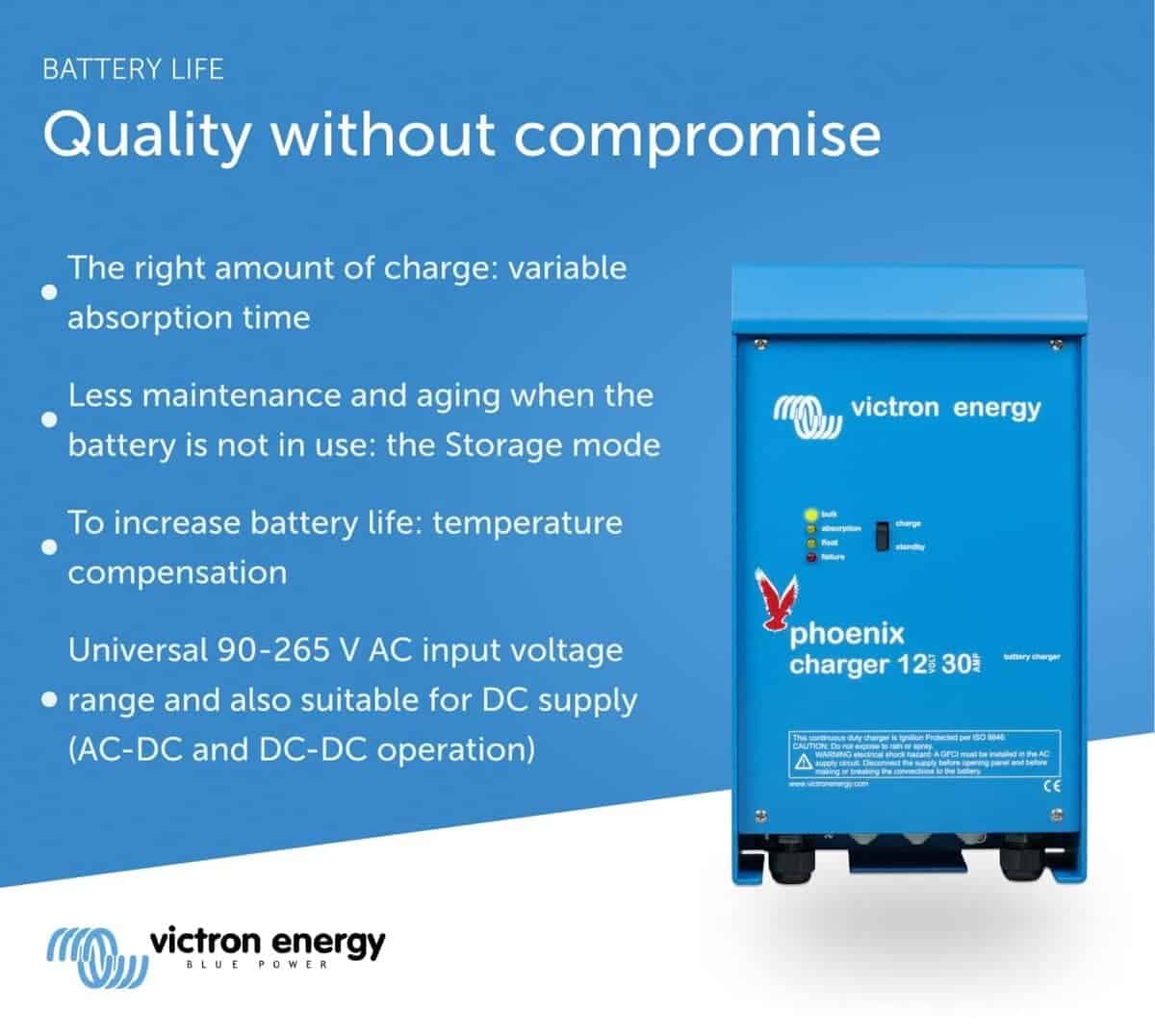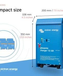 El cargador Phoenix de Victron Energy cuenta con un sistema de gestión de baterías adaptativo controlado por microprocesador que se puede preajustar para adaptarse a diferentes tipos de baterías. La característica adaptativa optimizará automáticamente el proceso de carga en función de cómo se esté utilizando la batería. Dos salidas de corriente completas y una salida de 4 amperios. Entrada universal 90-265V, 50/60Hz.