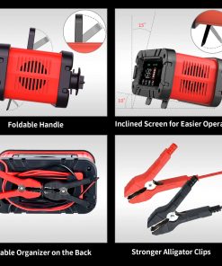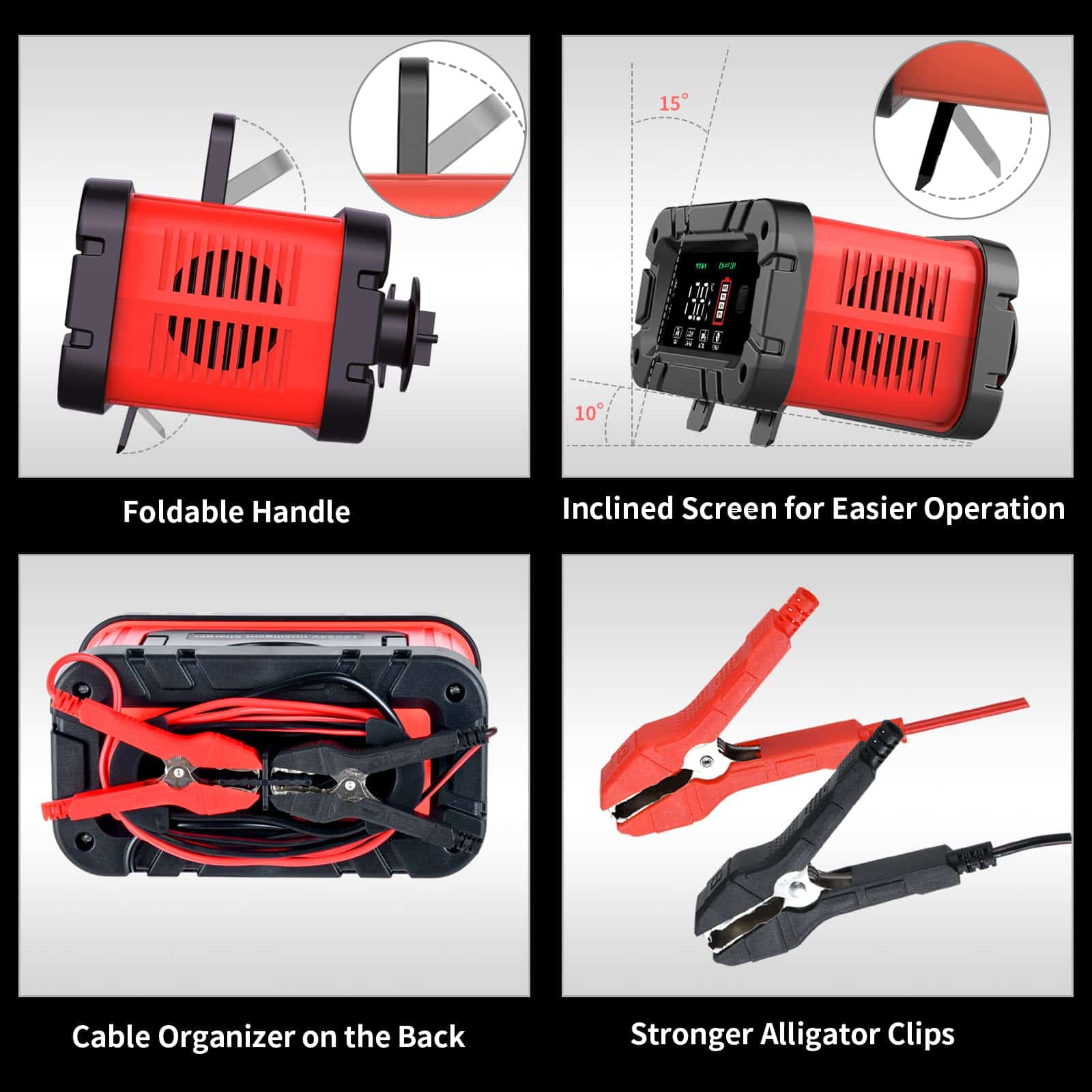 3. PANTALLA GRANDE VISUALIZADA DE CARGA El cargador de batería de coche actualizado cuenta con una pantalla súper grande, asa plegable y pies de soporte, brindándole un estado de carga claro y fácil de leer, voltaje, corriente, temperatura, batería llena, modo de verano, modo de invierno, etc. No más entrecerrar los ojos o adivinar, monitoree fácilmente la salud de su batería.