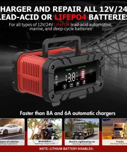 1. CARGADOR ADECUADO PARA LIfePO4 PLOMO ÁCIDO 12V/10A y 24V/5A cargador de batería rápido de 7 etapas, la velocidad de carga es mucho más rápida que los cargadores automáticos de 8A o 6A. Cargue o repare todas las baterías de automóviles, marinas y de ciclo profundo de 12V y 24V, incluidas LiFePO4, AGM, GEL, SLA, inundadas en automóviles, camiones, SUVs, motocicletas, cortadoras de césped, barcos marinos, etc. NO SE PERMITEN BATERÍAS DE LITIO.