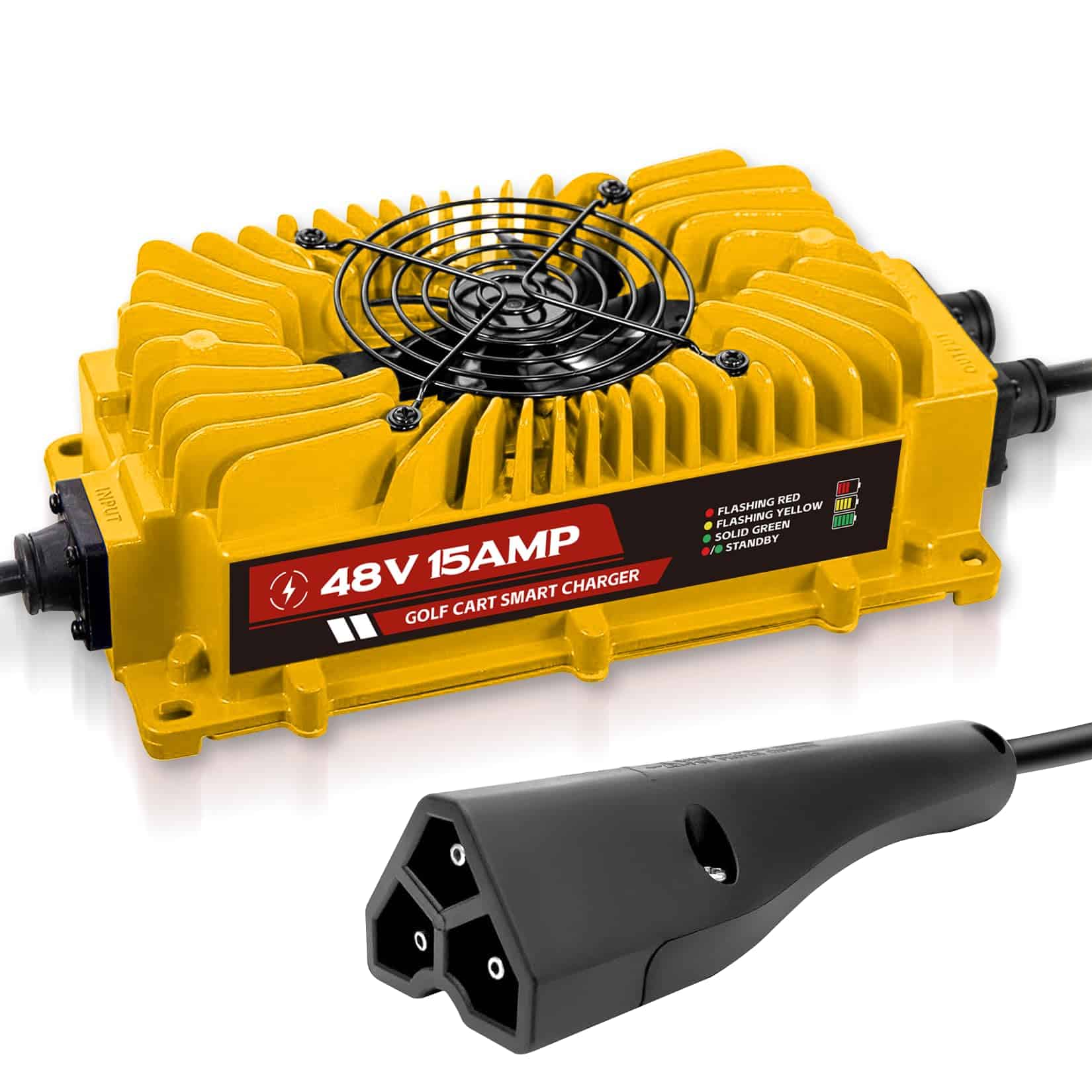 2. CARGADOR RÁPIDO E INTELIGENTE: Puede cargarse rápidamente con una carga completa en 4 a 6 horas. El cargador de baterías para carros de golf también cuenta con un temporizador de apagado automático de 15 horas para evitar la sobrecarga de baterías defectuosas.