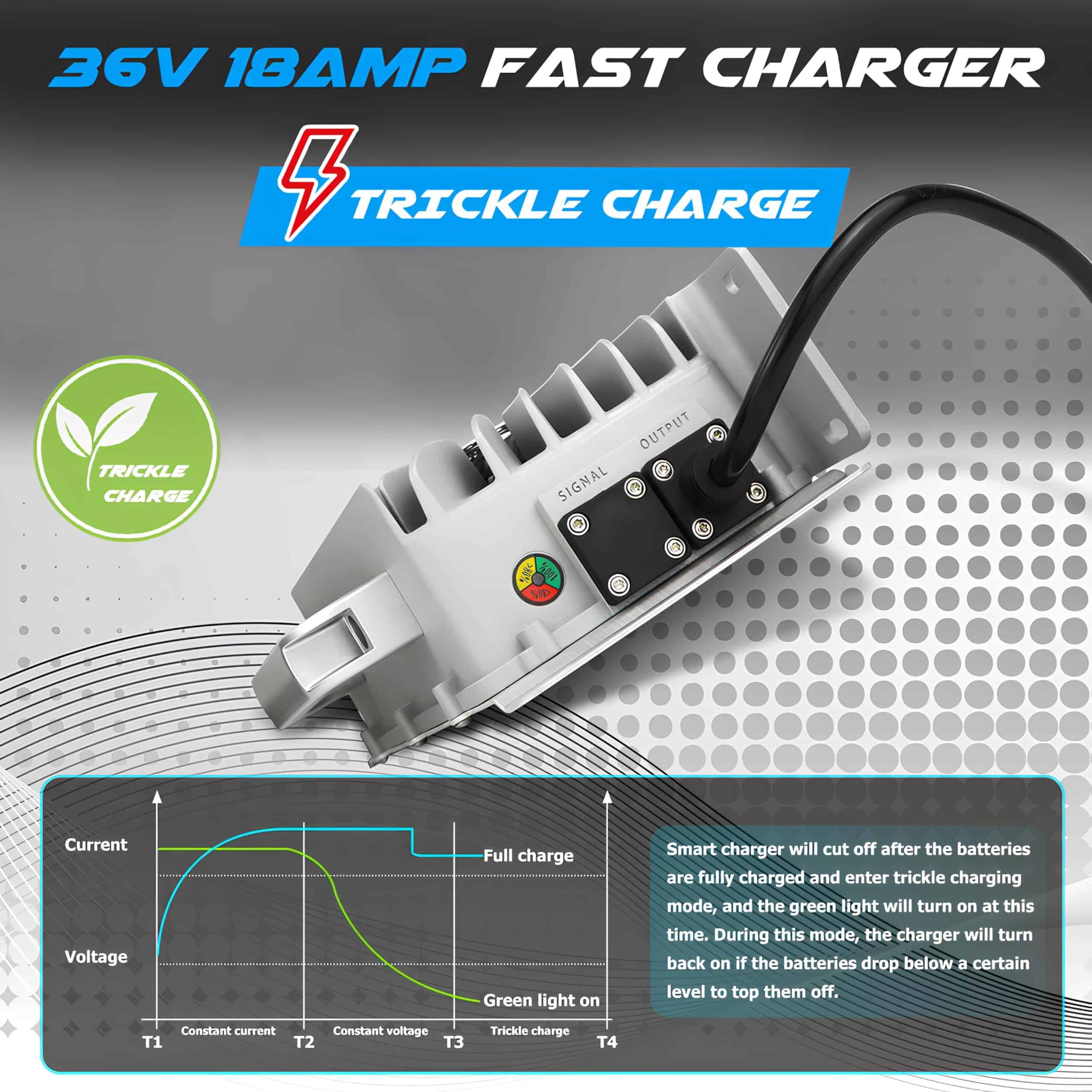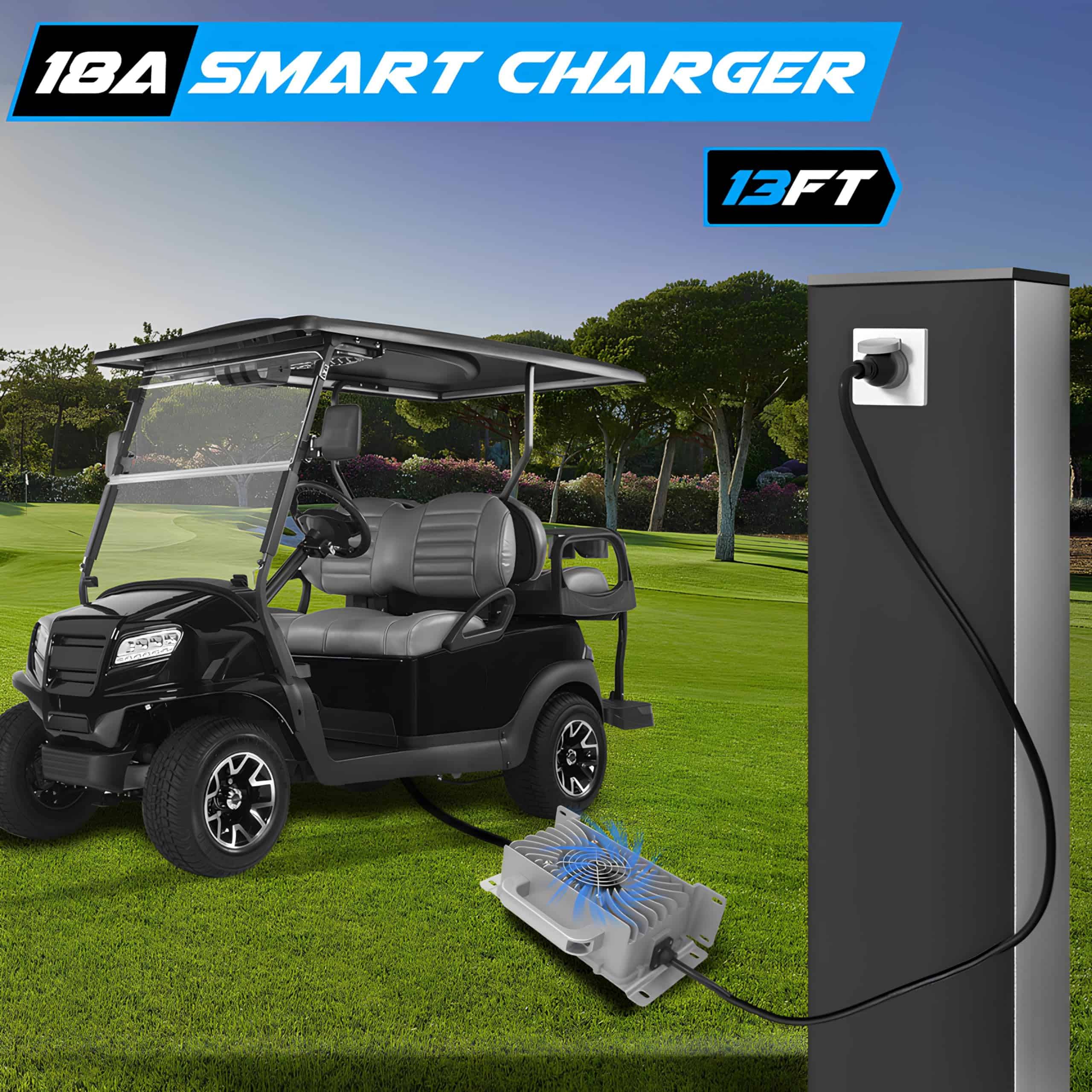 2. Carga Inteligente: Corriente de carga de 18 Amperios puede cargar rápidamente por completo su carro de golf. La tecnología de carga de múltiples etapas puede ajustar la potencia de carga según la condición de su batería.