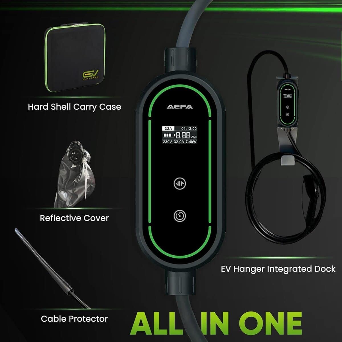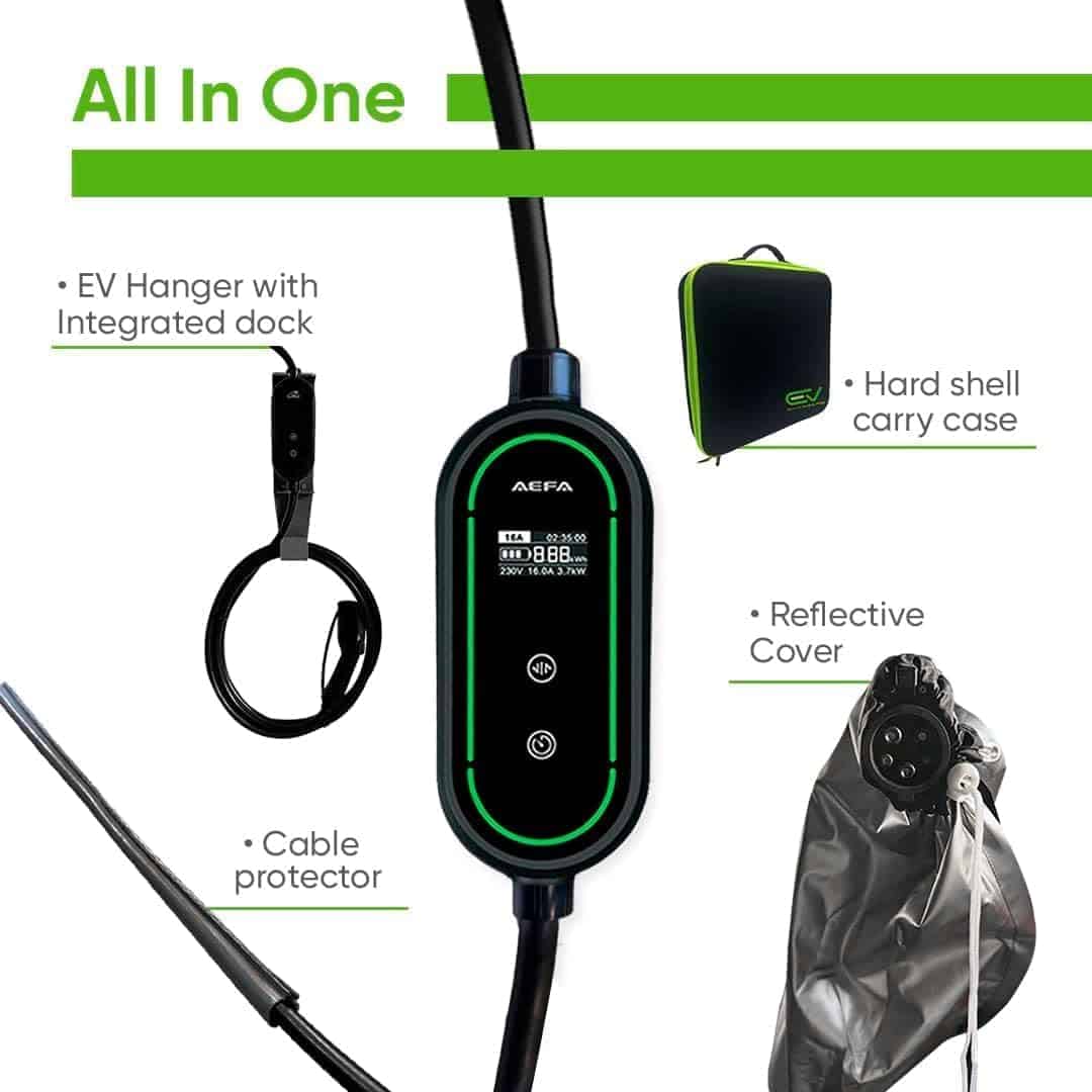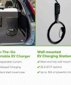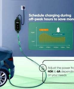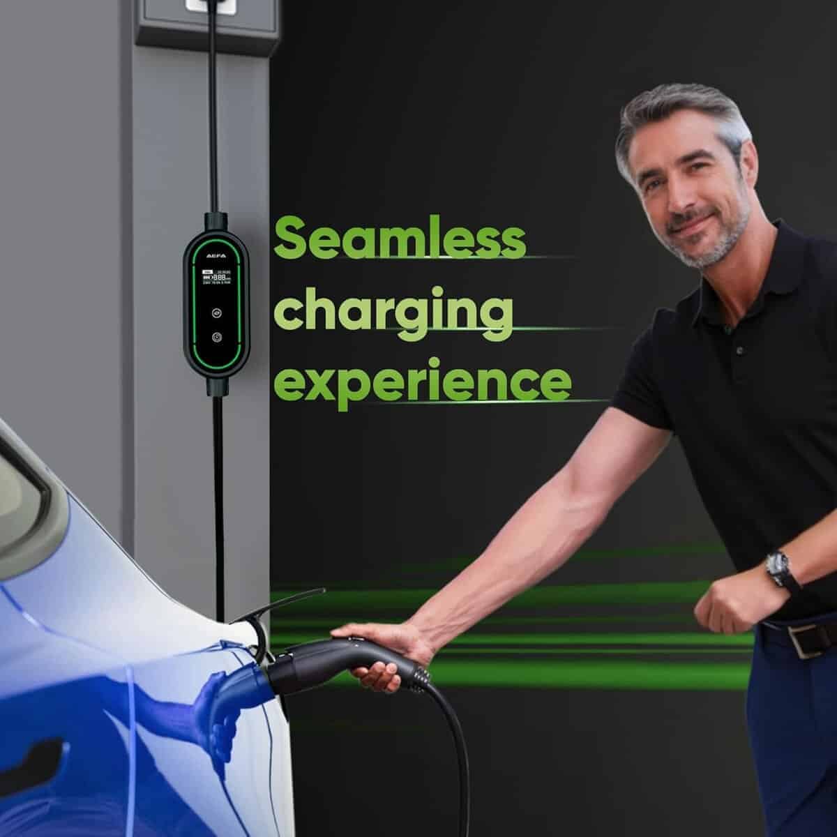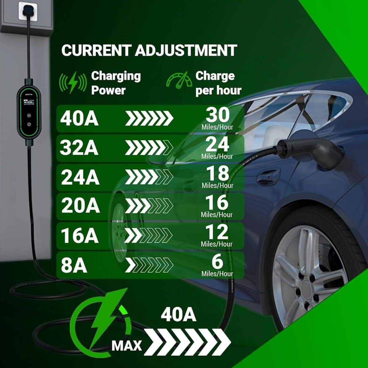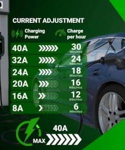 1. CARGADOR AJUSTABLE: El cargador de coche eléctrico AEFA NEMA 14-50 nivel 2 portátil proporciona hasta 32 AMP de potencia ajustable, permitiendo velocidades de carga de hasta 12 millas por hora. Incorporado con un temporizador de retraso para programar la carga durante las horas no pico, reduciendo los costos de electricidad mientras asegura que su coche eléctrico esté listo cuando se necesite. 2. COMPACTO Y PORTÁTIL: Nuestro cargador de coche eléctrico se puede usar tanto en el coche como en el hogar. Viene con un cable de 25 pies para garantizar la accesibilidad en diferentes ubicaciones, desde garajes hasta espacios de estacionamiento al aire libre. Su diseño ligero y compacto de 7.5 pulgadas, junto con un soporte para cable y un resistente estuche rígido, garantiza un fácil almacenamiento y transporte para los propietarios de coches eléctricos en movimiento. 3. PANTALLA LED E INDICADORES: Con una pantalla LED integrada en nuestro cargador de coche eléctrico, proporciona información importante, incluidos los niveles de potencia, el estado de transferencia de energía y notificaciones. Los indicadores luminosos permiten a los usuarios evaluar el progreso y mantenerse informados durante todo el proceso. 4. CARGA ORGANIZADA: Un sistema inteligente de gestión de cables mantiene ordenada su área de carga. La cubierta de cabeza resistente al agua del cargador de coche eléctrico nivel 2 y el cable de carga de coche eléctrico reforzado garantizan durabilidad en cualquier clima. También incluye un soporte para cable, un resistente estuche rígido y una cubierta resistente a la intemperie para proteger su equipo en interiores o exteriores. 5. COMPATIBILIDAD CON LOS VEHÍCULOS ELÉCTRICOS J1772: Este cargador de coche eléctrico portátil es compatible con todos los cargadores J1772, incluidos los modelos de Tesla con un adaptador, ofreciendo una carga fluida y eficiente en el hogar o en estaciones de carga de vehículos eléctricos.