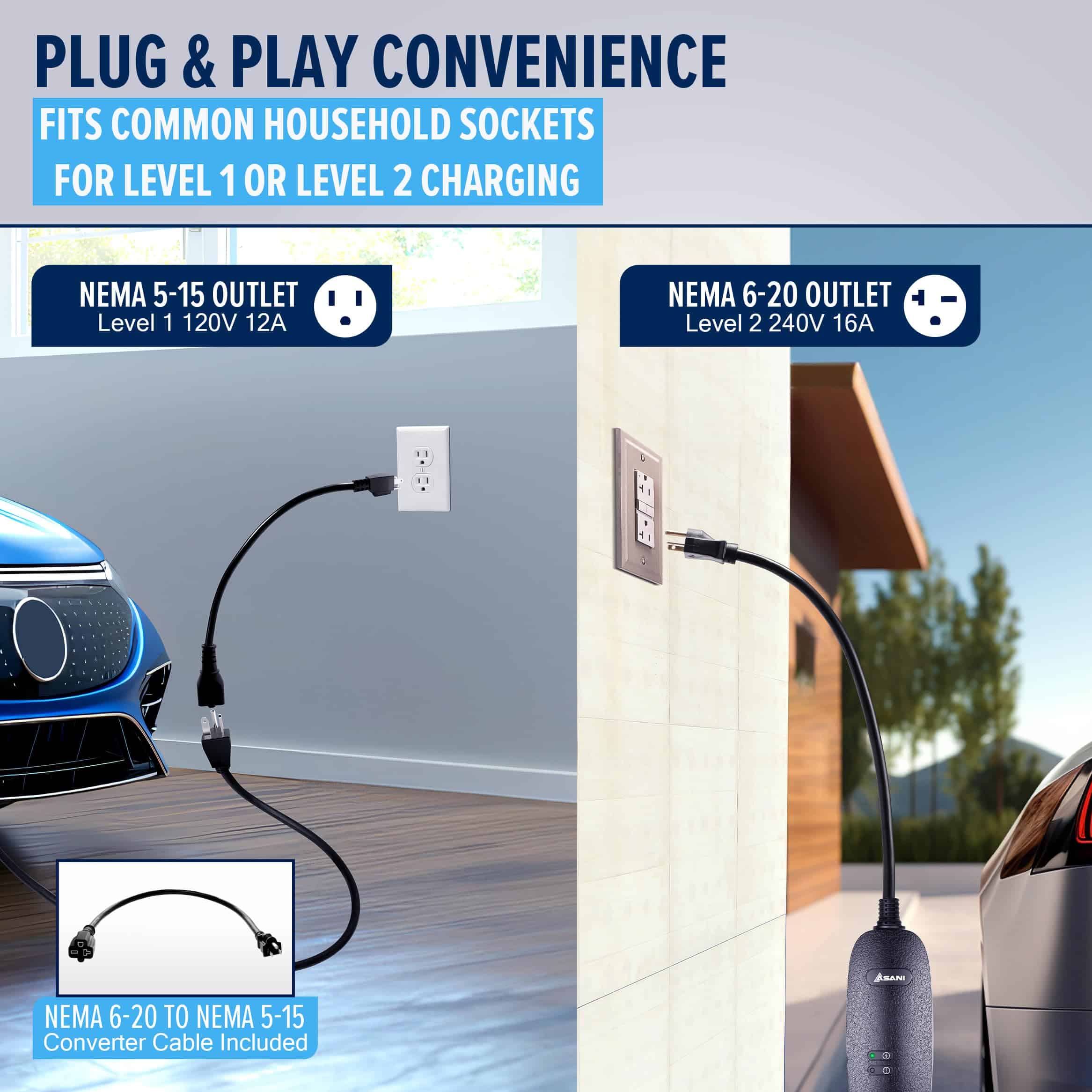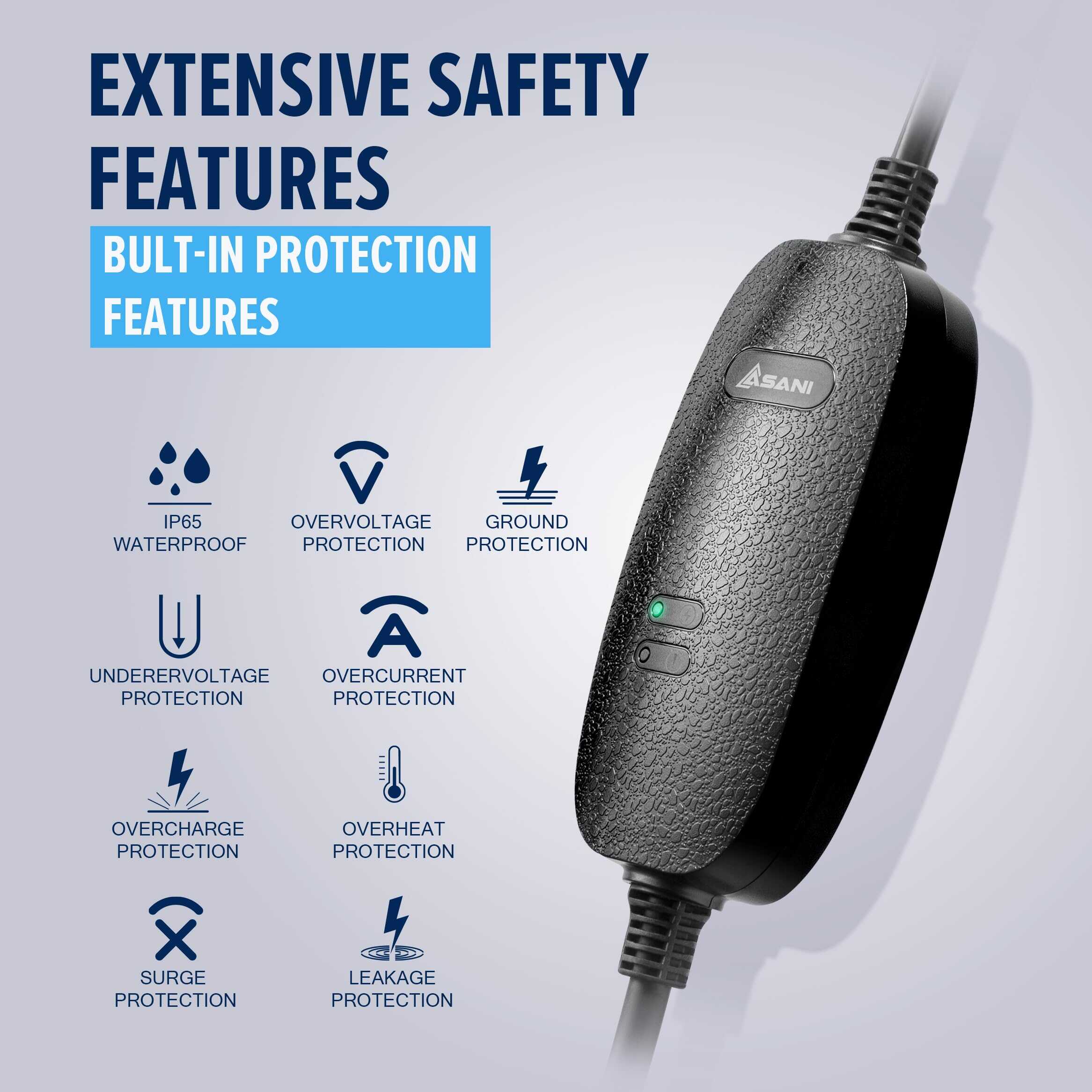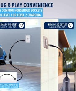 ¿Qué tal si pudieras obtener 48 millas de alcance en solo 4 horas? Con el cargador de coche eléctrico Asani nivel 2, es posible. Cargando 4 veces más rápido que los cargadores estándar, está diseñado para mejorar tu experiencia con vehículos eléctricos. Equipado con enchufes NEMA 6-20 y NEMA 5-15, ofrece compatibilidad con una amplia gama de vehículos eléctricos, garantizando opciones flexibles de carga en casa o sobre la marcha. La seguridad es primordial, con certificación CE y protección integrada contra riesgos eléctricos como relámpagos, sobretensión, sobrecarga y sobre corriente.
