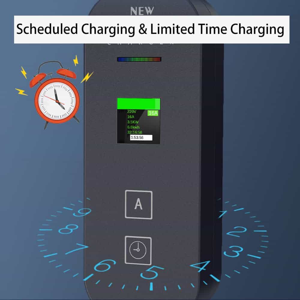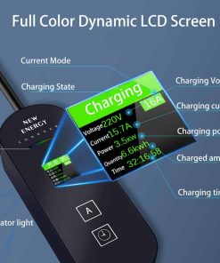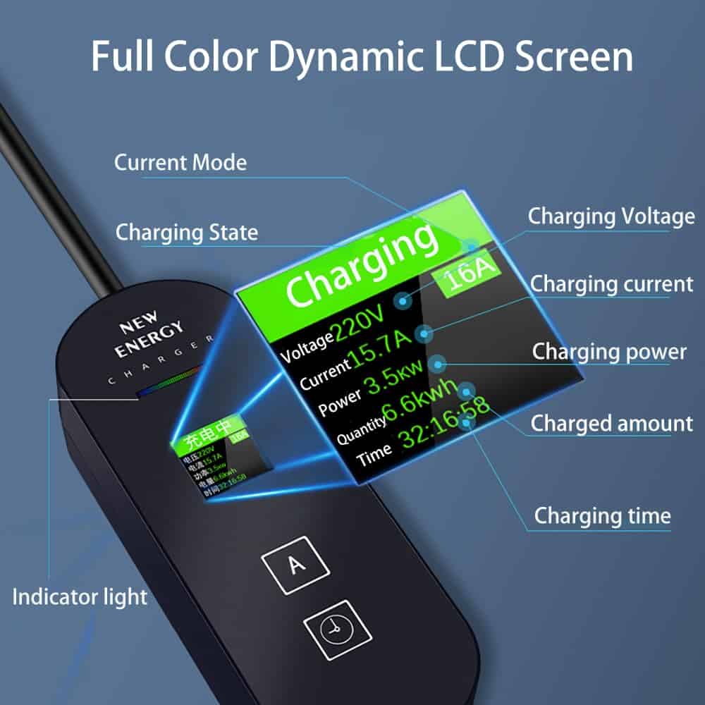 1. PANTALLA LCD INTELIGENTE Equipado con una pantalla LCD inteligente, nuestro cargador de vehículo eléctrico proporciona una representación visual clara del estado de carga, selección de corriente de cinco niveles y ajustes de carga programada. Entienda fácilmente el proceso de carga y realice ajustes según sea necesario. Este diseño inteligente lo mantiene informado sobre el progreso de la carga, asegurando que su carga siempre se alinee con sus planes.