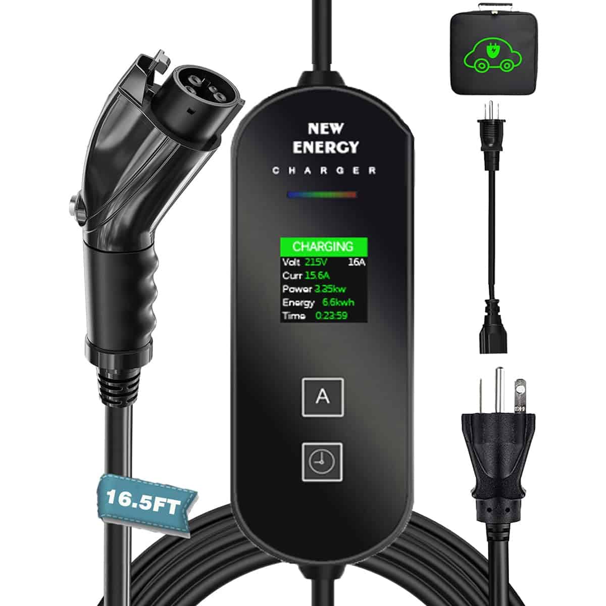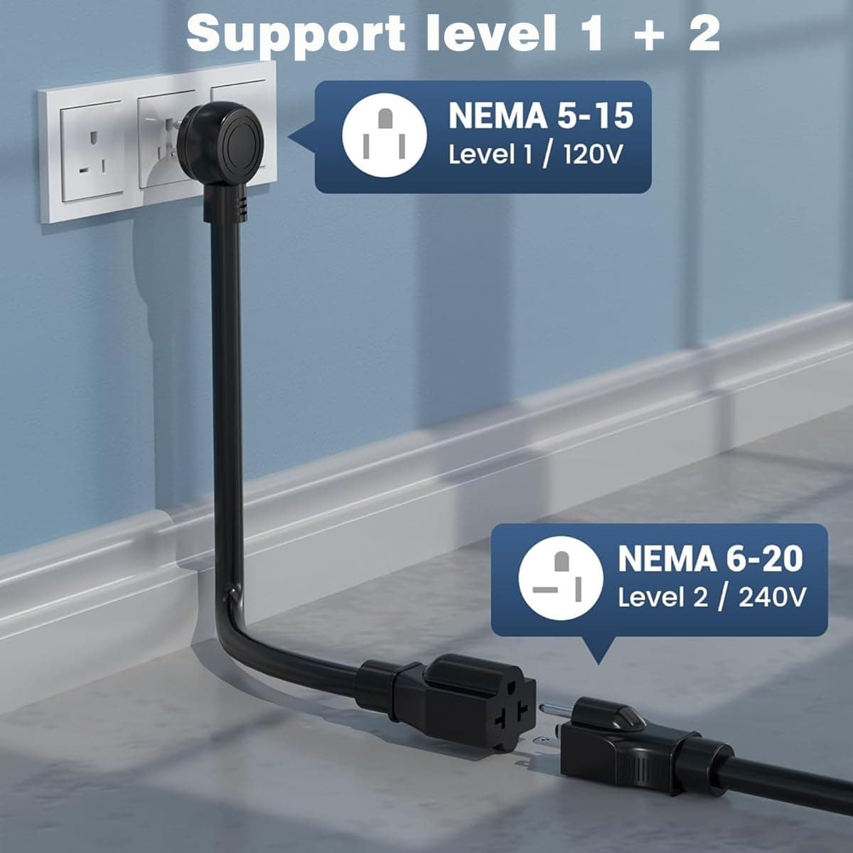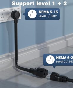 2. COMPATIBILIDAD ELEVADA DEL CARGADOR DE COCHES ELÉCTRICOS Nuestro cargador de coche eléctrico es compatible con vehículos eléctricos que cumplan con los estándares SAE J1772. Nuestro cargador de coche eléctrico viene con enchufes NEMA 5-15 y 6-20 que lo hacen adecuado para trabajar tanto en nivel 1 como en nivel 2. El cargador de vehículos eléctricos portátil tiene un cable de 16.5 pies, suficiente para la mayoría de entradas de vehículos o garajes. (NOTA: Tesla requiere un adaptador adicional).