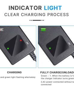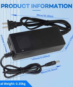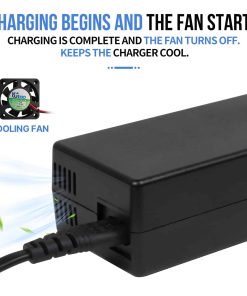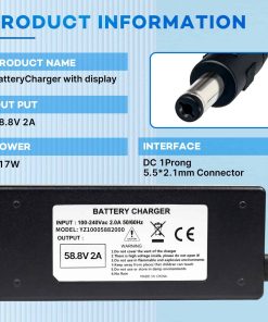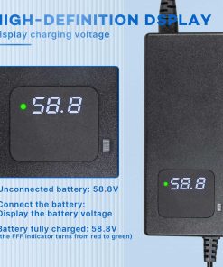 Cargador de corriente YZPOWER 58.8V 2A para batería de litio de 52V 14s. Este cargador inteligente es ideal para cargar baterías de 52V de 14 series de iones de litio. Con una entrada de 100-240VAC y una salida de 58.8V 2A, este cargador es capaz de cargar rápidamente las baterías. El conector es un modelo recto de 1 agujero 5.5×2.1mm, lo que garantiza una conexión segura y estable. La carcasa del cargador está hecha de ABS resistente a caídas y al calor, con un ventilador incorporado que asegura una disipación de calor eficiente y segura. Además, cuenta con múltiples protecciones de seguridad, como la desactivación automática cuando la batería está completamente cargada y protección contra sobrecargas, sobretensiones, sobrecalentamientos, tiempo de carga excesivo y cortocircuitos. El cargador también está equipado con un display que muestra el voltaje de la batería durante la carga. El indicador luminoso parpadea en rojo y verde alternativamente durante la carga, y se vuelve verde cuando la carga está completa. Este cargador es compatible con una amplia gama de marcas de baterías de iones de litio de 52V de 14 series, lo que lo hace ideal para su uso en diversas aplicaciones.