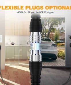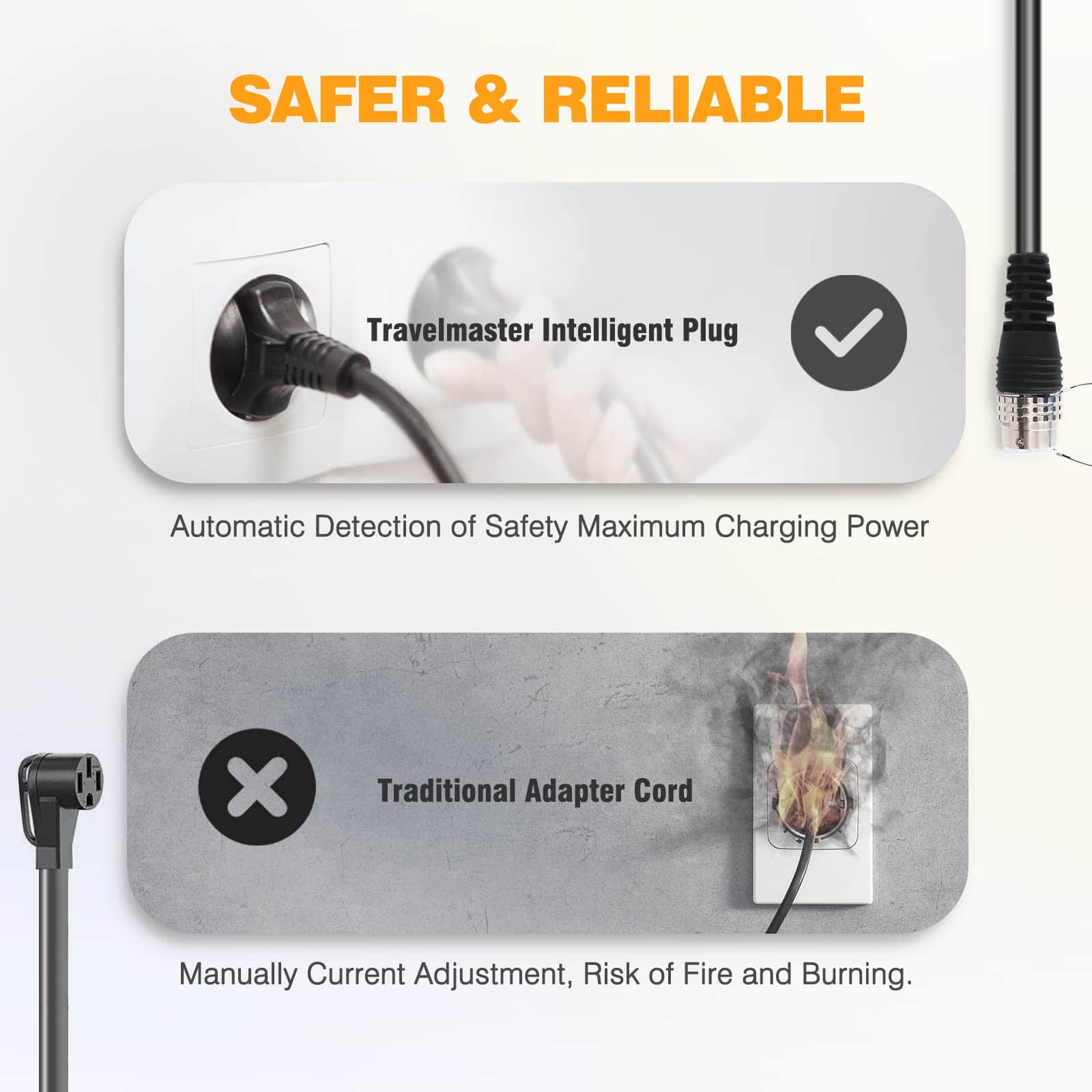 3. CARGUE EN CUALQUIER TOMACORRIENTE, EN CUALQUIER LUGAR, EN CUALQUIER MOMENTO: El TRAVELMASTER con conector SAE J1772 puede cargar casi todos los automóviles eléctricos. Viene con dos enchufes adaptadores estándar. El enchufe adaptador NEMA 14-50 se puede utilizar para cargar rápidamente su vehículo en una toma de corriente de 32 amperios. También puede conectar este cargador de EV a una toma de corriente doméstica NEMA 5-20 en caso de emergencia. Los enchufes adaptadores opcionales para tomas NEMA 6-20, NEMA 10-30, NEMA 14-30, TT-30, NEMA 6-50 y NEMA 10-50 le brindan un uso ilimitado de cualquier enchufe.