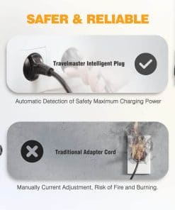 4. CARGA MÁS RÁPIDA: Con el TRAVELMASTER, puede cargar hasta 6 veces más rápido que en un enchufe de corriente doméstico estándar. Verifique cuidadosamente la corriente máxima de carga de CA y la potencia máxima de carga de CA (KW) de su vehículo para ver cuán rápido se cargará la batería de su automóvil eléctrico para que pueda volver rápidamente a la carretera.