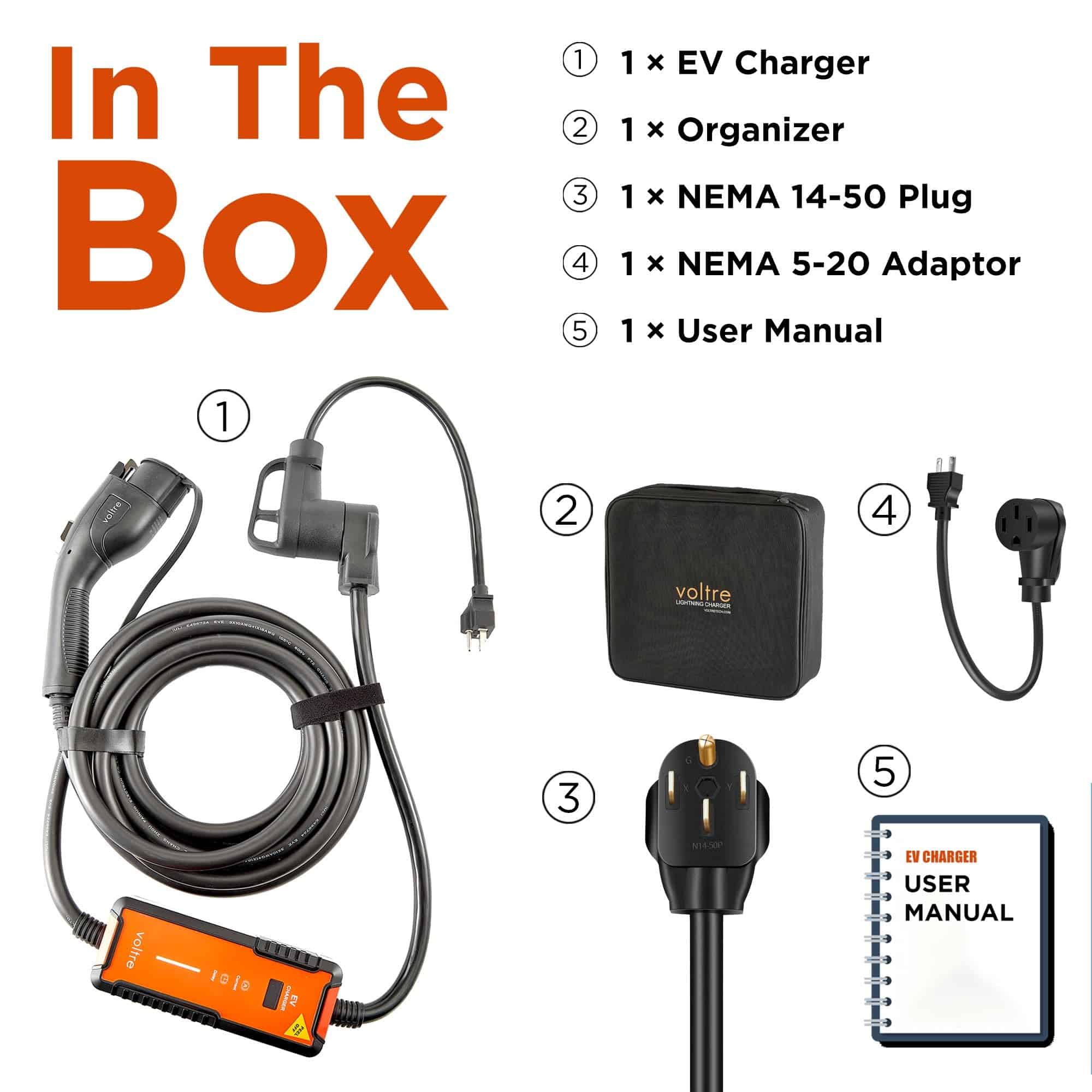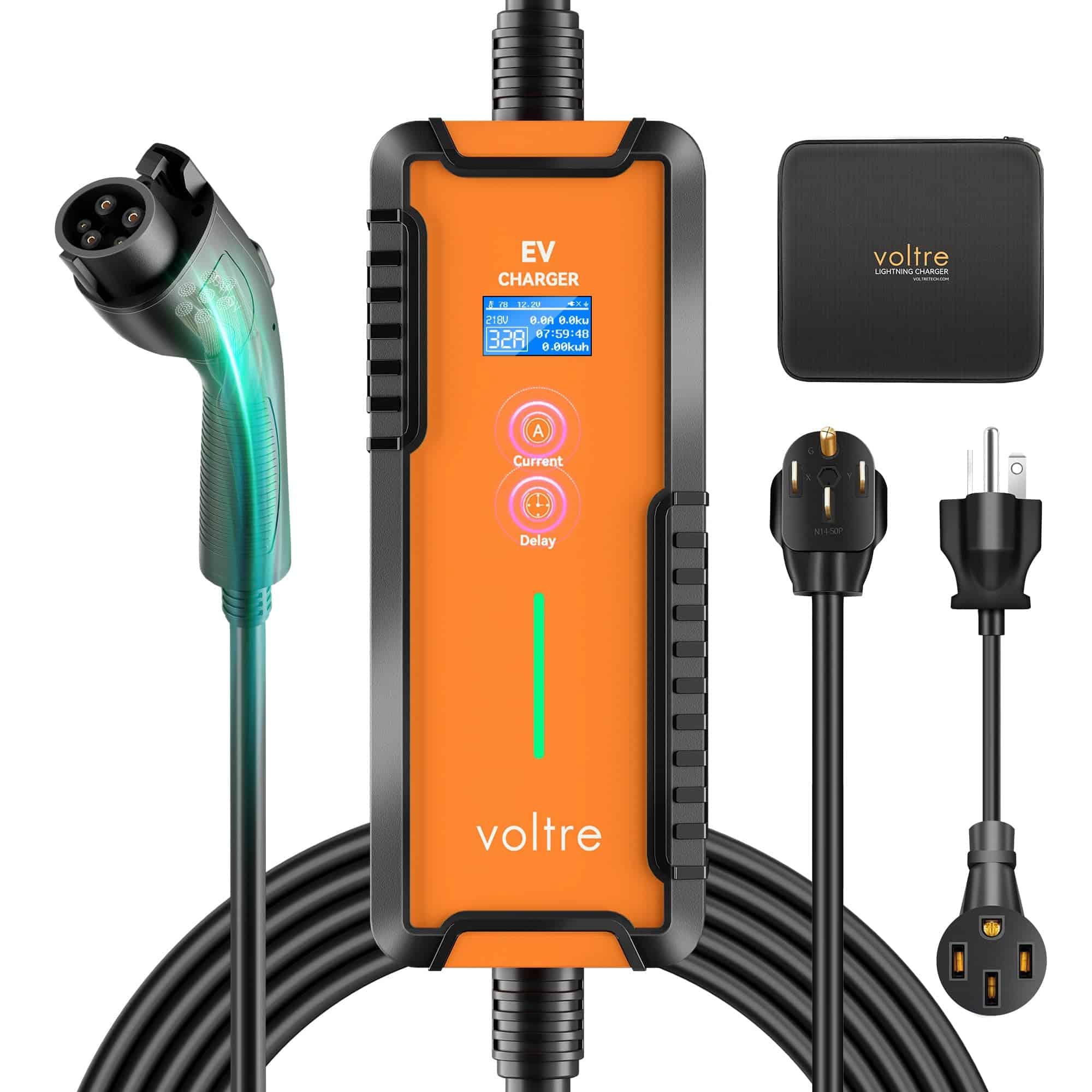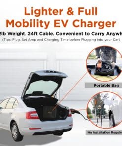 4. CARGADOR ELÉCTRICO PORTÁTIL MÁS LIGERO Y CON PLENA MOVILIDAD PARA LLEVAR. El cargador de coche eléctrico portátil Voltre pesa solo 13.2 lb. y viene con un estuche compacto para un almacenamiento fácil en el maletero de su vehículo. Disfrute de la libertad de cargar su EV dondequiera que vaya, proporcionando plena movilidad. Compañero ideal de Cargador de Nivel 2 y 1 para EV, ofreciendo una flexibilidad y conveniencia inigualables para sus necesidades de viaje por carretera.