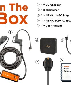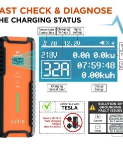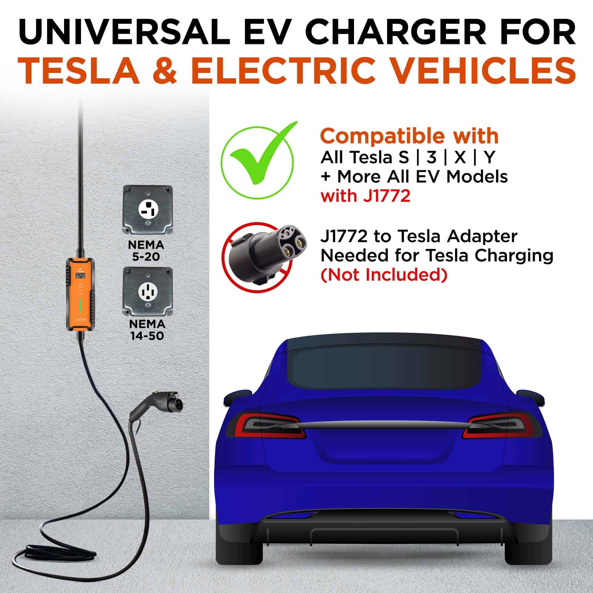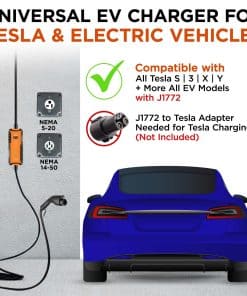 1. CARGADOR DE VEHÍCULOS ELÉCTRICOS UNIVERSAL PARA TESLA + LA MAYORÍA DE LOS MODELOS EV. Voltre M2 Cargador de Nivel 1 y Nivel 2 compatible con Tesla 3/Y/S/X (se necesita adaptador J1772 a Tesla – NO INCLUIDO), compatible con EVs SAE J1772 (por ejemplo: compatible con Nissan, Chevrolet, Ford, BMW, Audi, Volkswagen, Jaguar, Kia Hyundai, otros modelos de coches eléctricos).