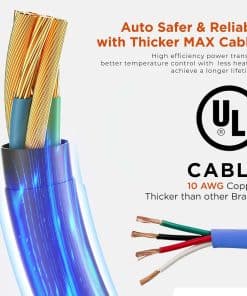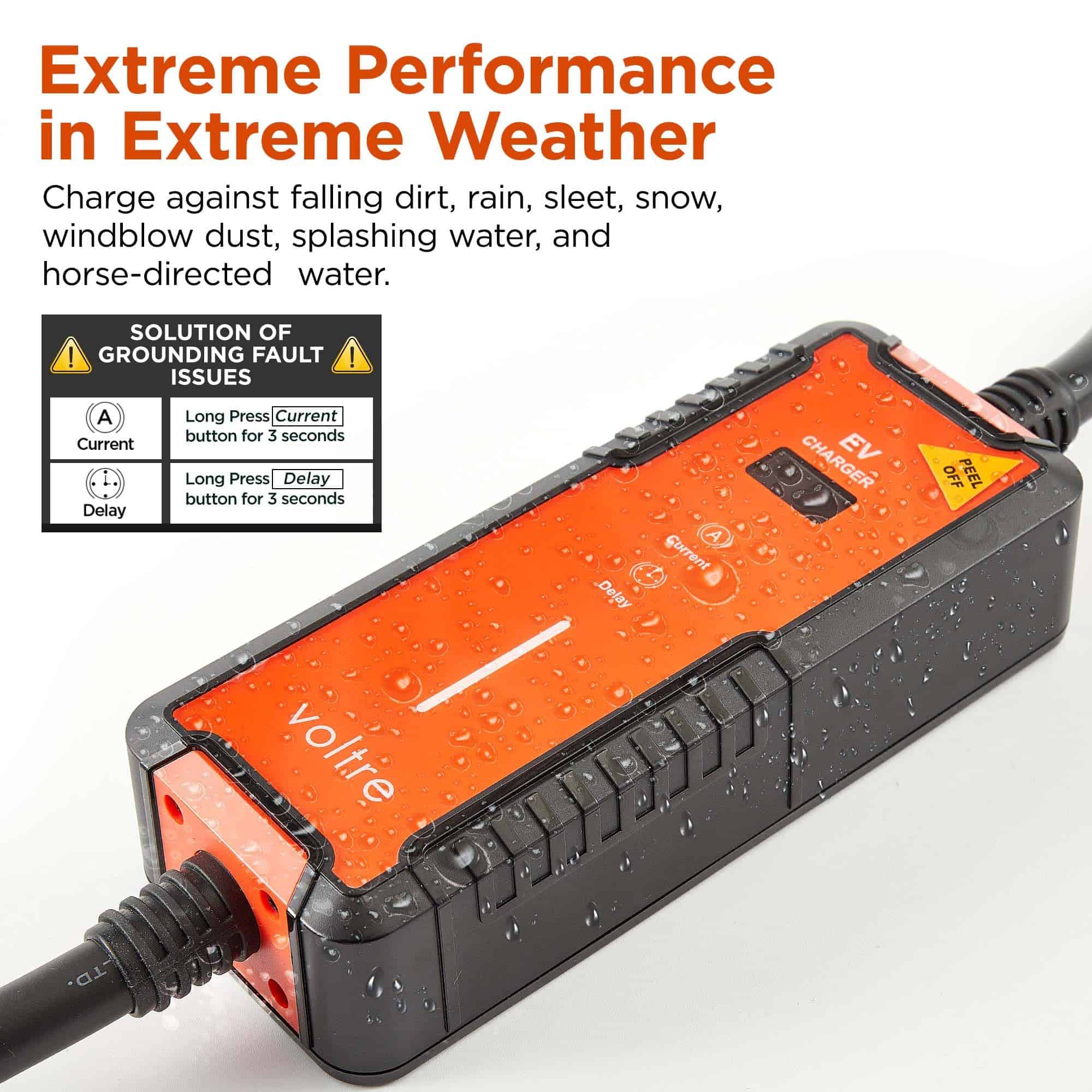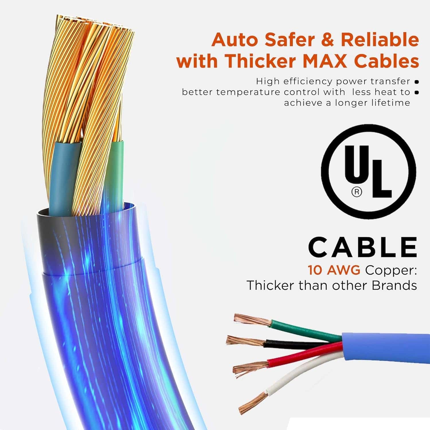 3. SEGURIDAD Y DURABILIDAD MEJORADAS CON CABLES MÁXIMOS MÁS GRUESOS. Los cargadores de Nivel 1 y Nivel 2 de Voltre cuentan con cables UL Reconocidos con cobre de 10 AWG superior, más gruesos que los competidores, asegurando una transferencia de energía más segura y eficiente. Diseñado para soportar condiciones climáticas extremas, las cajas NEMA (IP65) protegen los componentes del cargador del polvo, la lluvia, la nieve, asegurando un funcionamiento óptimo de -22 F ~122 F.