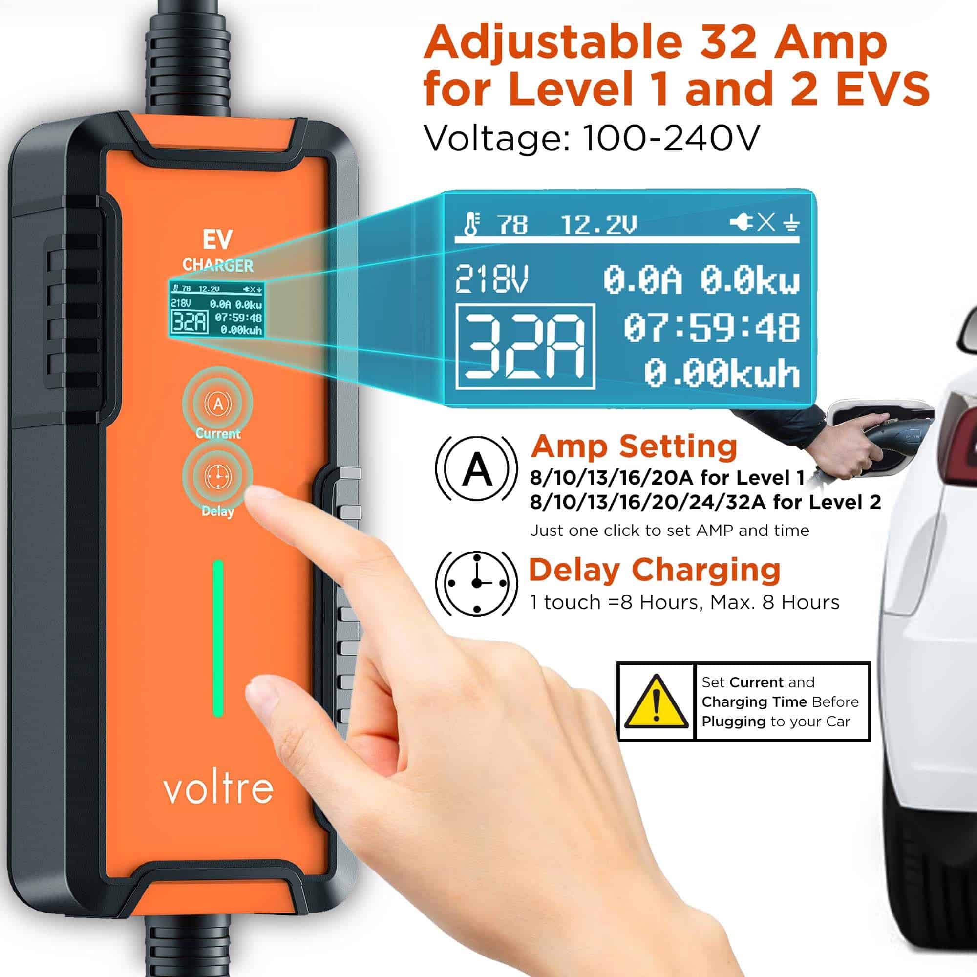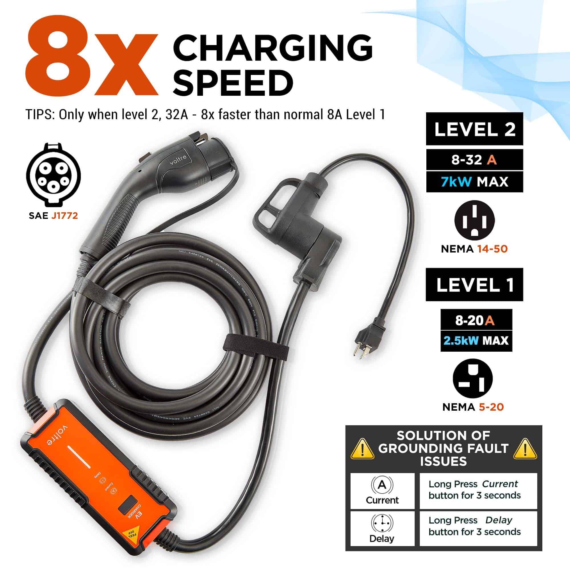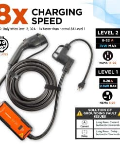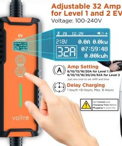 2. CARGADOR DE 2 EN 1 PARA APOYAR VEHÍCULOS EV ANTIGUOS Y NUEVOS. El cargador EV Voltre admite carga de Nivel 1 y Nivel 2, con ajuste de 8/10/13/16/20/24/32A. Compatible con modelos EV Tesla y SAE J1772. El enchufe NEMA 14-50 proporciona carga de Nivel 2 de hasta 32A 240V (7KW Máx.), ofreciendo una carga 8 veces más rápida que los cargadores de Nivel 1 estándar. Nivel 1: 20A (Máx) 120V usando adaptador 5-20, perfecto para coches eléctricos más antiguos y más nuevos.