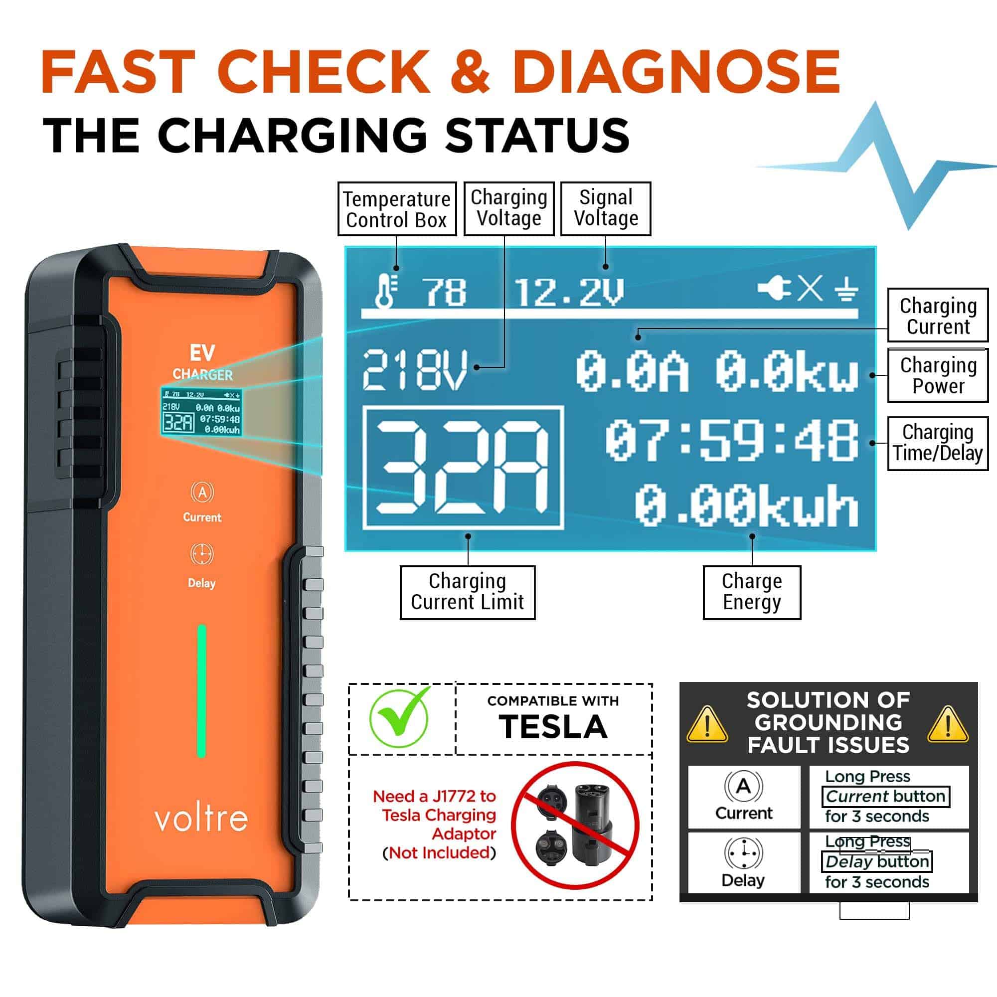 5. TECNOLOGÍA DE CONEXIÓN Y CARGA SIMPLE: NO SE REQUIEREN APLICACIONES. Configuración y proceso de carga sencillo. Seleccione la potencia, enchufe en la pared, ajuste la corriente (8-32A), establezca el retraso (1-8 horas) y conecte el J1772 al EV. (Se requiere un adaptador de carga J1772 a Tesla para los vehículos Tesla). La pantalla LED muestra la temperatura y el estado de carga, proporcionando informes rápidos. Para Nivel 1, 20A Máx para adaptadores 5-20.