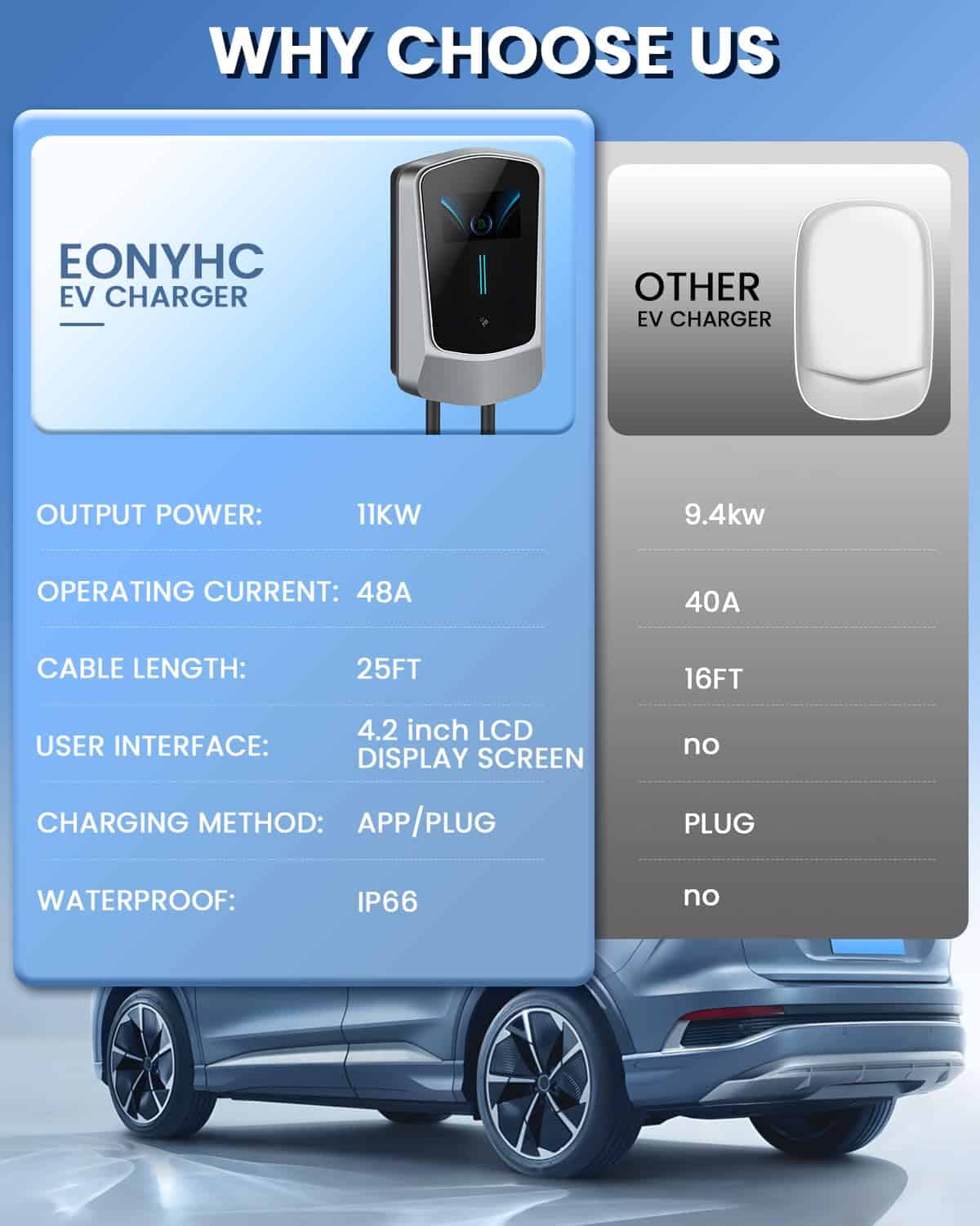1. Capacidad de carga de 48 amperios: Cargue su vehículo eléctrico de manera rápida y eficiente con una salida robusta de 48 amperios. Este cargador de Nivel 2 reduce significativamente el tiempo de carga en comparación con los cargadores estándar de Nivel 1, asegurando que su vehículo esté listo para usar cuando lo necesite. La fuente de alimentación de 240V suministra la energía necesaria para cargar su VE a una velocidad más rápida, lo que lo hace ideal para el uso diario.