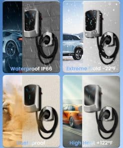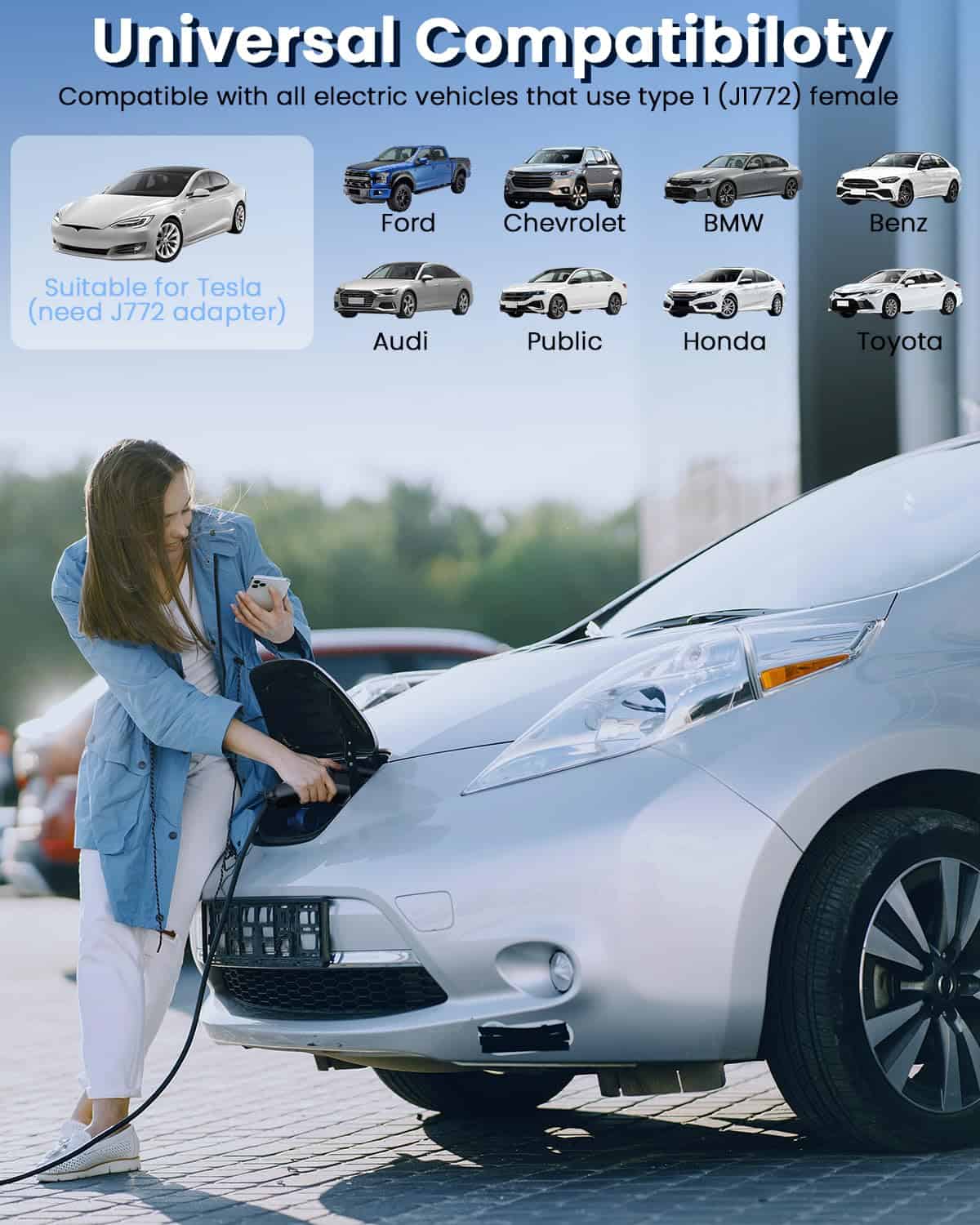 3. Compatibilidad universal e instalación fácil: Conector para automóvil J1772 El cargador cuenta con un conector universal para automóviles J1772, lo que lo hace compatible con la mayoría de los vehículos eléctricos en el mercado, incluidos los modelos populares de Tesla (se requiere adaptador), Nissan, Chevrolet, Ford y más. Esto garantiza que el cargador sea una adición versátil a su configuración de carga de VE.