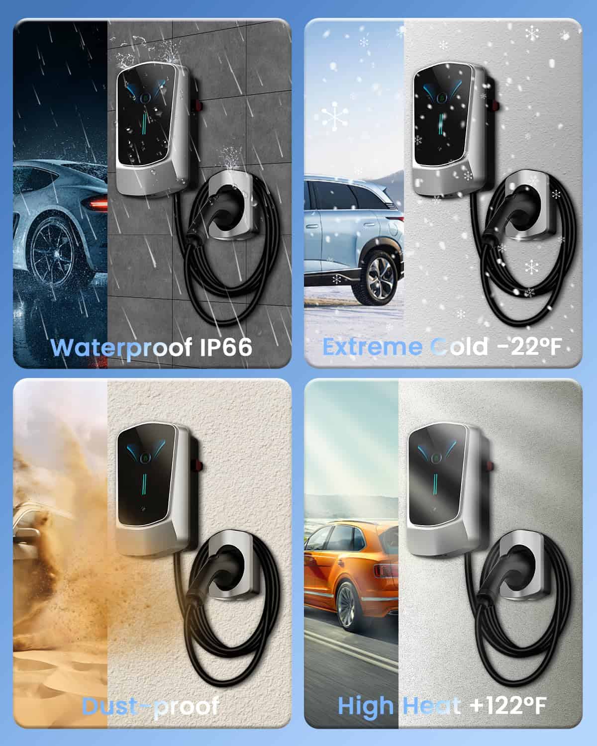 4. Uso en exteriores e interiores: Diseñado para entornos tanto al aire libre como interiores, este cargador de VE está construido para resistir diversas condiciones climáticas, desde la lluvia hasta temperaturas extremas. Su construcción duradera garantiza un rendimiento confiable, ya sea instalado en un garaje o montado en exteriores.