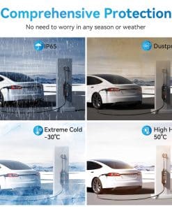 5. Protección de Seguridad: El cargador de automóviles eléctricos de Nivel 2 está hecho de material TPU resistente y a prueba de presión, proporcionando protección contra sobrecalentamiento; resistencia a altas temperaturas; protección contra lluvia, nieve y bajas temperaturas y resistente al agua IP65. El poste de carga se puede utilizar en condiciones húmedas o secas sin miedo.