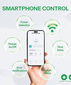 Además, el control y monitoreo inalámbrico a través de su smartphone le permite verificar remotamente la tensión del sistema, la temperatura del sistema y configurar su corriente de carga desde la comodidad de su teléfono. Con un diseño compacto y móvil, este cargador viene con un cable de 22 pies y un conector NEMA 14-50, lo que le permite cargar en cualquier lugar.