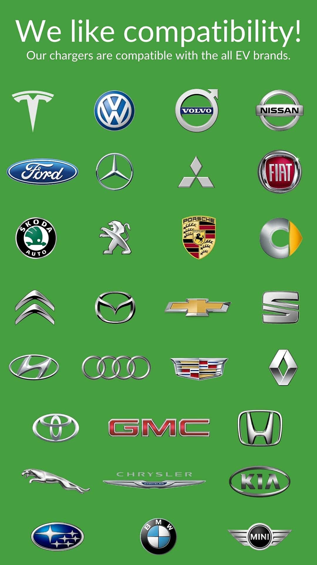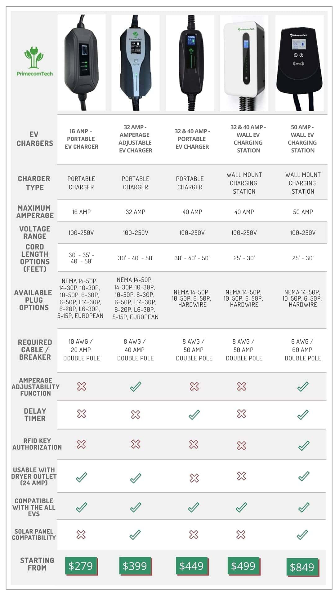 Cargador inteligente PRIMECOM, compatible con todos los autos eléctricos y vehículos híbridos enchufables.