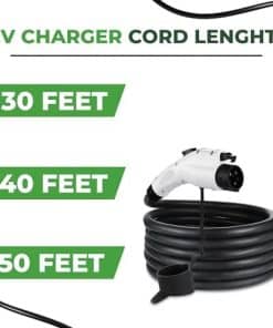 Debido a esta característica de ajuste de amperaje, puede utilizar su toma de corriente existente para la secadora sin incurrir en costos caros de instalación. Hasta 6 veces más rápido que su cargador de 110v 32 Amperios 220 Voltios 7.6KWatt Clasificación de Potencia Funciona con todas las marcas de vehículos eléctricos e híbridos enchufables: Vehículos híbridos enchufables como TESLA, BOLT, VOLT, LEAF, FIAT, BMW, FOCUS, PRIUS, e-Golf, RAV4, Mercedes, HONDA y muchas más marcas. Longitudes de cable de 30, 40, 50 pies y 11 tipos diferentes de tomas NEMA disponibles: como NEMA 10-30, 14-30, 14-50, 10-50, 6-50, 6-20, etc. Se apaga automáticamente cuando la carga se ha completado. IP56 Clasificado para uso en exteriores: a prueba de condiciones climáticas: puede funcionar con LLUVIA POLVO SOL, etc.