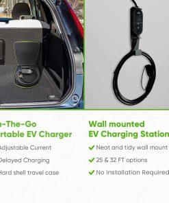 2. COMPACTO Y PORTÁTIL: Este cargador de VE Nivel 2 viene con un cable de 32 pies para garantizar la accesibilidad en varios lugares, desde garajes hasta espacios de estacionamiento al aire libre. Su diseño liviano y compacto de 7.5 pulgadas, junto con un gancho para colgar el cable y un estuche resistente, garantiza un fácil almacenamiento y transporte para propietarios de VE en movimiento.