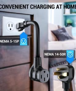 1. Soporta Nivel 1 & Nivel 2: El cargador de coche eléctrico para J1772 cuenta con un cable de alimentación NEMA 5-15P a 14-50R para una conversión eléctrica doméstica sin problemas, compatible con vehículos electrónicos de Nivel 1 y Nivel 2. Con un cable de 23 pies, puedes utilizar sin esfuerzo tu cargador EV con tomas de corriente estándar. Además, el gancho J incluido puede ayudarte a organizar los cables y evitar que se enreden o se desordenen.