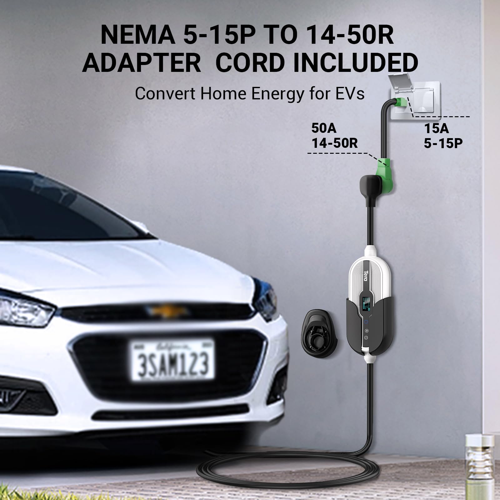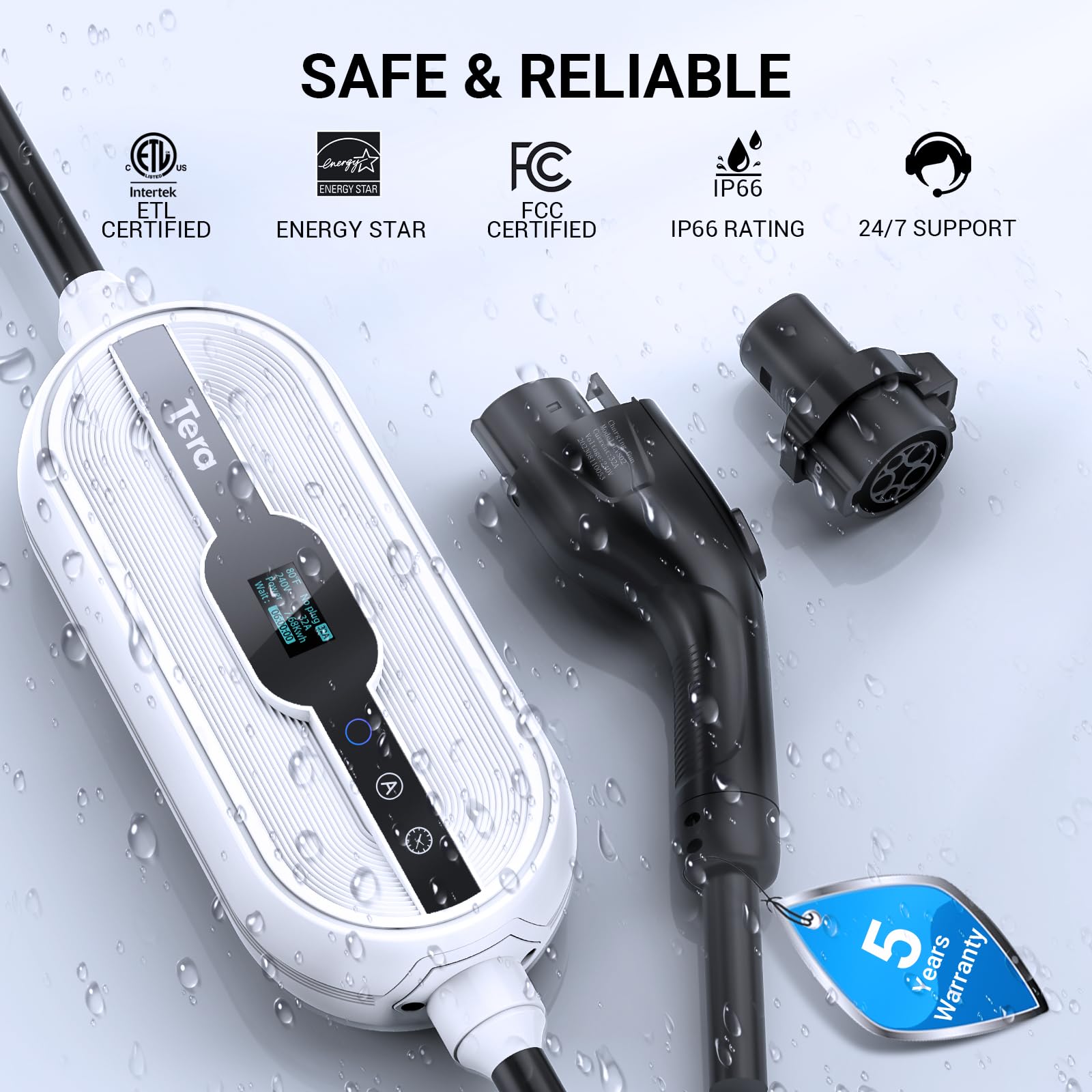 El cargador de Vehículo Eléctrico (EV) portátil Tera, compatible con Tesla y todos los EV con SAE J1772, ofrece Nivel 1 y Nivel 2 hasta 32A 120V 240V, con Wi-Fi y Bluetooth habilitado ETL Cable de Carga de 25FT con Soporte Estación de Carga, Conector NEMA 14-50, NEMA 5-15 Fácil Instalación, Cable de 25 ft para uso interior y exterior. El cargador es la solución perfecta para vehículos eléctricos, ofreciendo múltiples funciones de seguridad como protección contra fugas, tierra, voltaje alto / bajo, cortocircuito, sobrecarga y protección contra sobretemperatura. También incluye un soporte de pared y una bolsa de almacenamiento para mayor comodidad. ¡Experimenta la verdadera libertad de viajar a donde quieras ir con este cargador EV portátil! Este cargador eléctrico para vehículo EV para garaje ofrece una clasificación IP66, asegurando su resistencia a lo largo de todas las estaciones. Ya sea en interiores o exteriores, el cargador EV portátil es la solución perfecta para EVs.