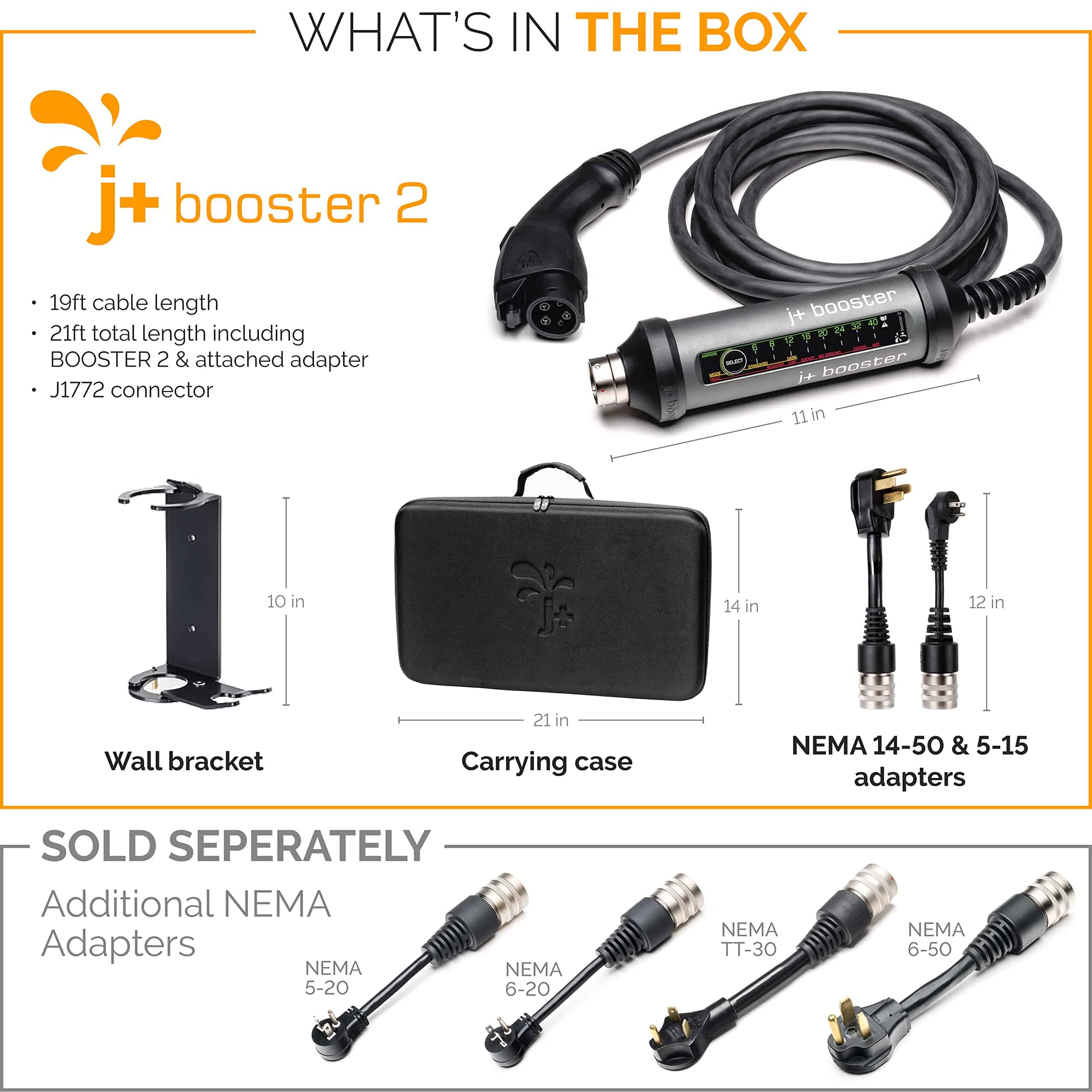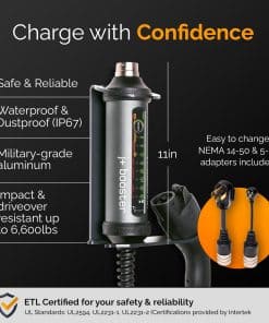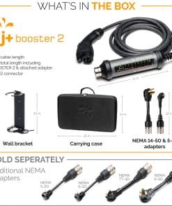 J+ BOOSTER 2 es el cargador de pared ultra portátil con adaptadores para cada toma de corriente. Cargue en casa o sobre la marcha con hasta 40 amperios para una carga rápida de nivel 2. Funciona con todos los EV’s, no se requiere instalación de cableado. Viene listo para usar con adaptadores NEMA 14-50 y 5-15. BOOSTER 2 es el único EV Charger resistente a impactos y a ser conducido por encima, y es capaz de soportar cargas de ruedas de hasta 6,600 libras. Resistencia al agua y suciedad IP67, además de aluminio de grado militar para que pueda cargar en todo tipo de clima y condiciones. 100% compatible con todos los coches eléctricos e híbridos enchufables. Incluye un estuche conveniente con cierres de gancho y lazo para un almacenamiento seguro del vehículo cuando viaja. También se incluye un soporte de pared resistente para un acceso y almacenamiento fácil en casa.