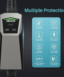 4. CONFIABILIDAD AL MÁXIMO – El sistema de detección de chip inteligente en el cargador de vehículos eléctricos de MEGEAR brinda seguridad y protección confiable mediante la detección de sobrecalentamiento, desbordamiento de corriente, sobretensión, baja tensión, sobrecarga de energía y fugas. Además, la estación de carga de EV de 40A de MEGEAR es compatible con todos los EV estándar SAE J1772.
