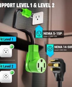 Además, es compatible con carga Nivel 1 y Nivel 2, lo que lo hace versátil y conveniente para su uso en casa, en la oficina o en movimiento. Con un cable de 25 pies, este cargador ofrece una carga rápida y confiable para su vehículo eléctrico.