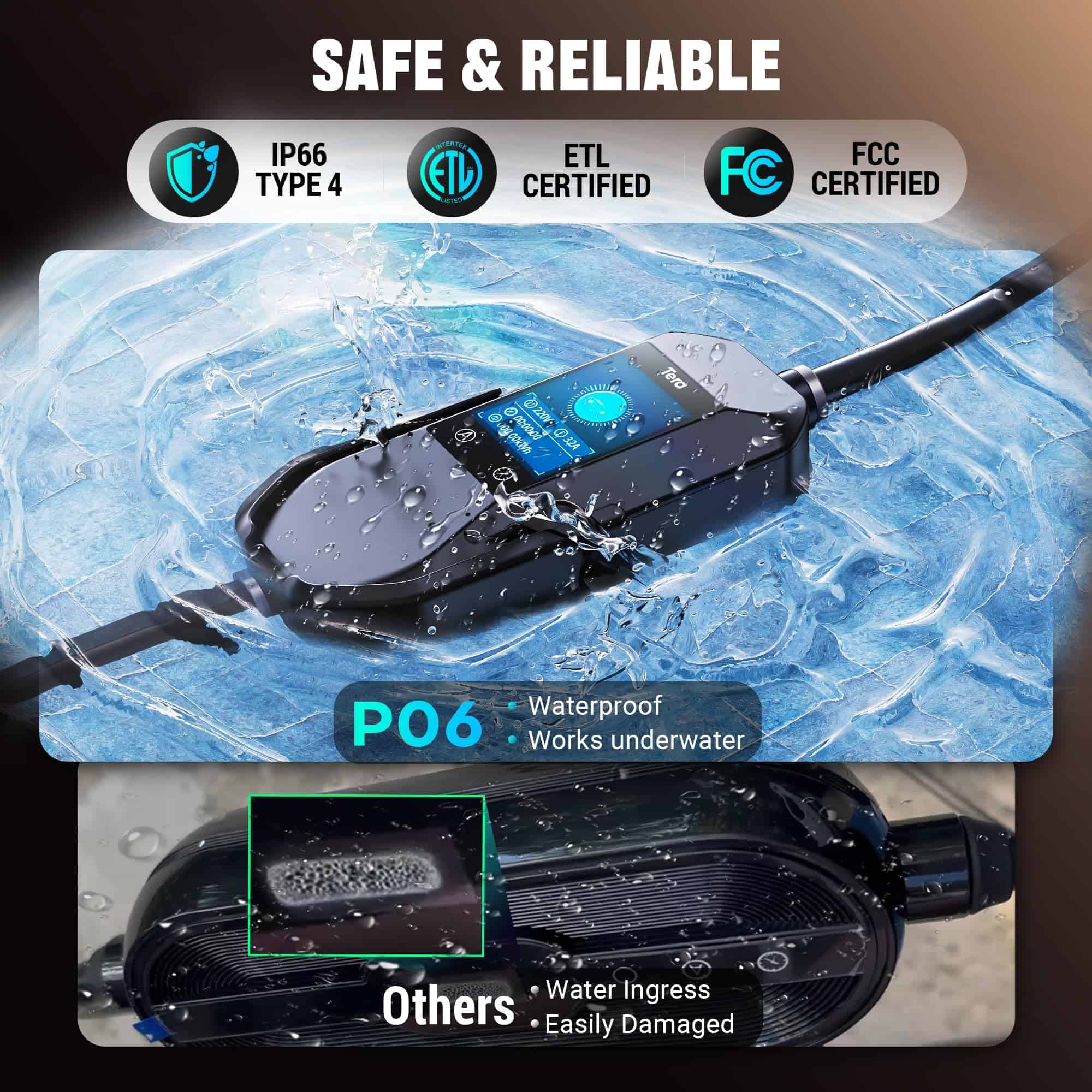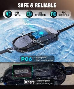 El cargador cuenta con una patente impermeable IP66 que lo hace apto para funcionar incluso cuando está sumergido. Es ETL/FCC certificado, lo que garantiza seguridad y protección contra sub/sobretensión, sobrecarga, sobrecalentamiento, puesta a tierra y paradas de emergencia. Funciona de manera confiable en una amplia gama de temperaturas, desde -22 F hasta +122 F.