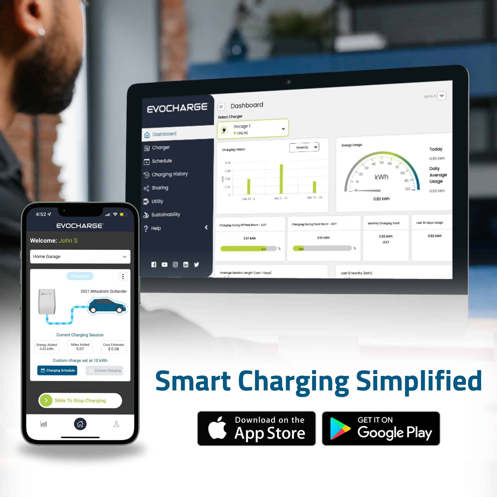 3. Carga Inteligente Simplificada – Utilice la aplicación móvil y el portal de escritorio de EvoCharge para una fácil gestión; programe la carga, comparta acceso, vea todos sus datos de carga y más.