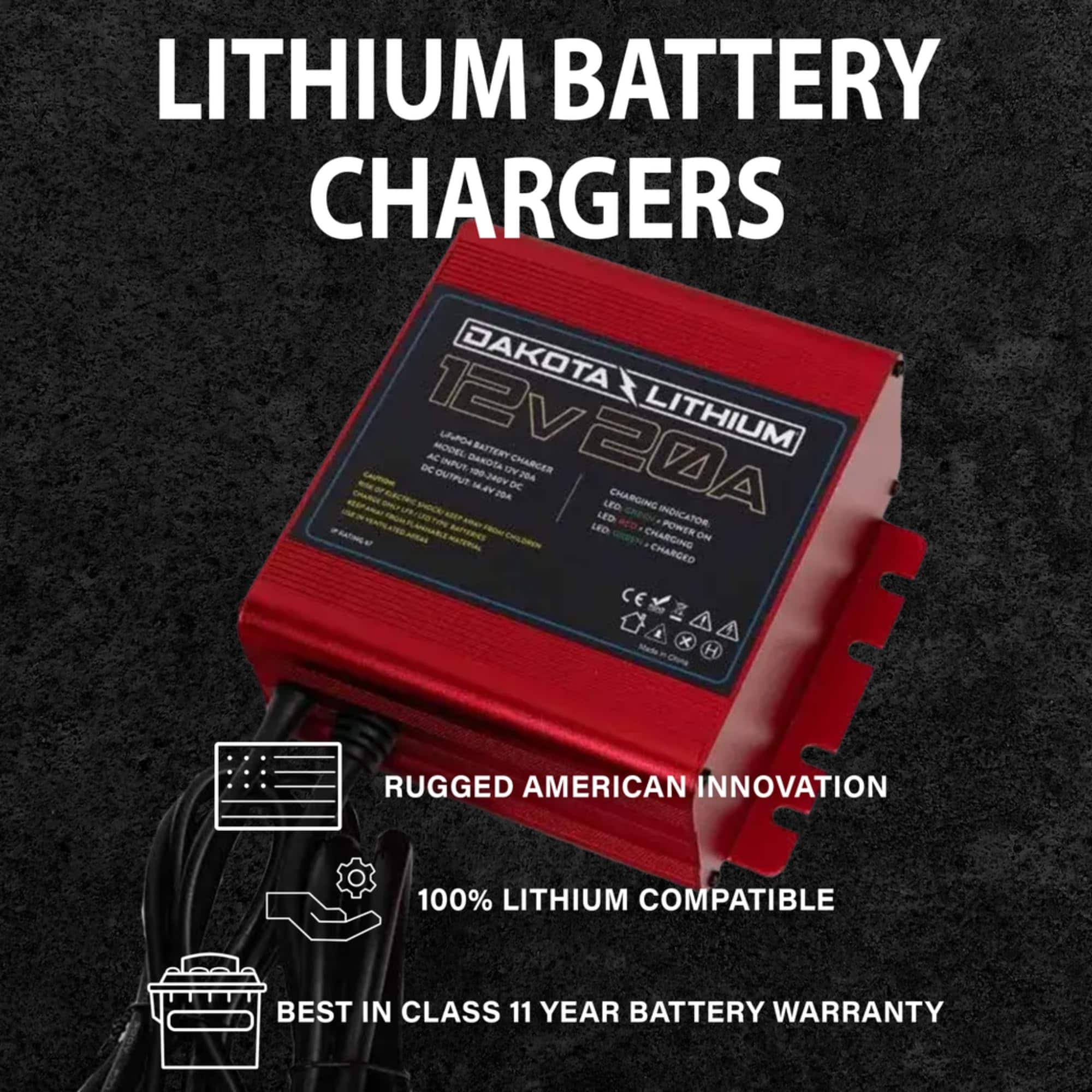 Cargador impermeable de 20 amperios y 12V de Dakota Lithium