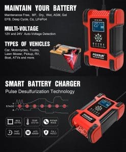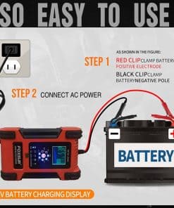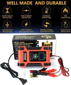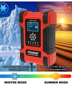 Cargador automático inteligente aplicable a varios vehículos, incluyendo coches, motocicletas, cortacéspedes, vehículos eléctricos, barcos, etc. Con 7 etapas de carga automática para proteger la batería de sobrecarga. Es compatible con la mayoría de los tipos de baterías de plomo-ácido. Tecnología de conmutación, protección de polaridad, protección contra cortocircuitos, control de temperatura, eficiencia del 85%. Ajuste automático de la tensión de carga según la temperatura ambiente, con modo invierno y verano. Seguro para niños con bloqueo automático del botón durante la carga.