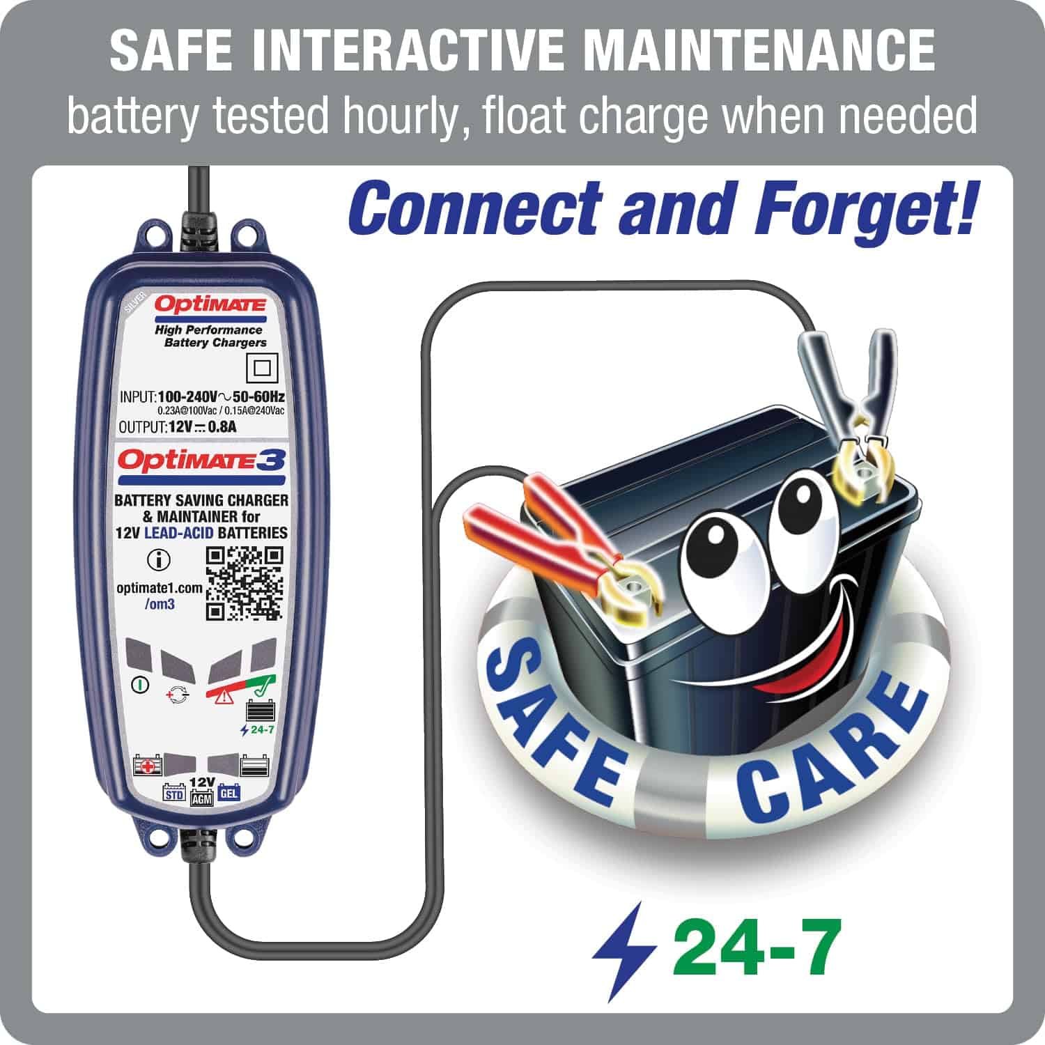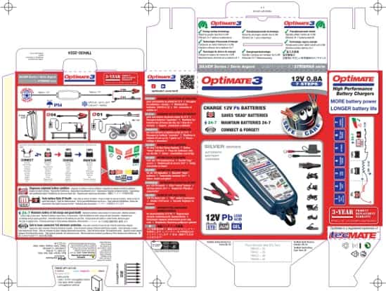 El OptiMate3 0.8A es un cargador inteligente diseñado para mantener las baterías de plomo-ácido de 12V en óptimas condiciones, ya sean de tipo AGM, GEL, STD, Starter o Deep Cycle, utilizadas en motocicletas, ATV, Side by Side o motos acuáticas personales. Este cargador es la solución perfecta para salvar tu batería cuando ningún otro cargador funcione. Conecta y olvídate, este cargador proporciona una carga continua si la batería está saludable, se detiene y avisa si hay alguna falla. Además, ofrece protección las 24 horas del día al prevenir la descarga de la circuitería conectada y garantiza una mayor potencia de la batería. Realiza pruebas de forma automática e indica si hay algún problema con la batería. Recomendado por Honda, Yamaha, Kawasaki, KTM, Husqvarna y varios fabricantes de baterías a nivel mundial. Su estuche completamente sellado protege contra derrames y lluvia ligera.