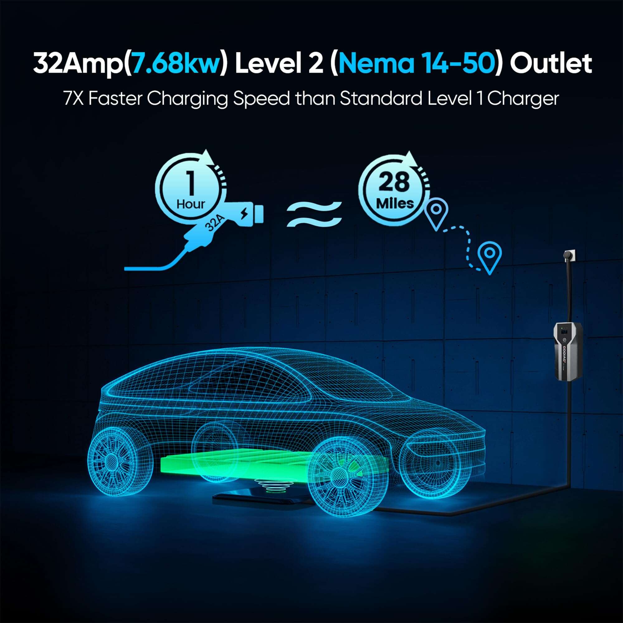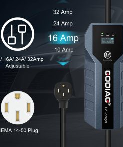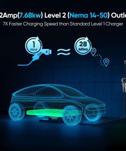 1. Carga Ultra Rápida: Experimenta una carga super rápida con el cargador para autos eléctricos Godiag nivel 2. Con una potente salida de 32 Amperios (7.68kw) y fuente de alimentación de 240V, ofrece hasta 44 millas de autonomía por hora, y es 6 veces más rápido que la carga estándar de Nivel 1 (110V) de 16 Amperios.