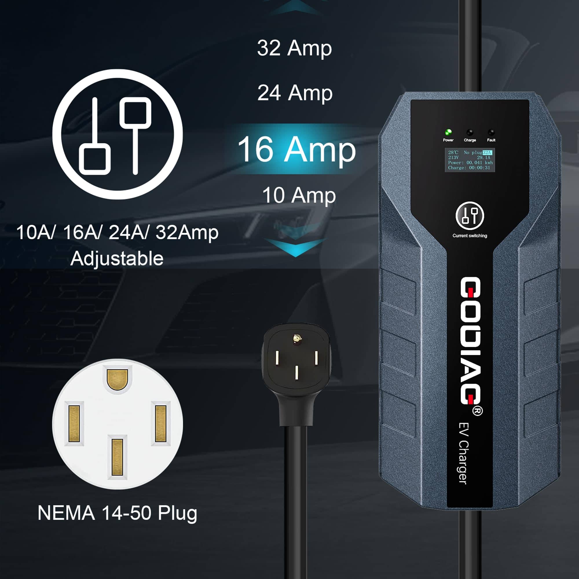 5. Pantalla LCD Informativa: El cargador para autos eléctricos con enchufe NEMA 14-50 cuenta con una pantalla LCD fácil de usar que proporciona información en tiempo real, como temperatura, voltaje/corriente de carga, duración de carga y kWh de potencia. NOTA: Ofrecemos una garantía de 12 meses y soporte técnico de por vida.