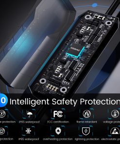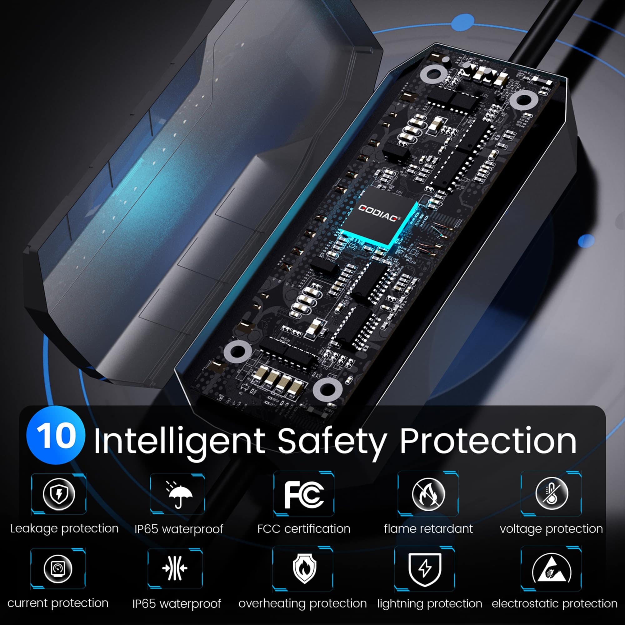 4. Úsalo con Confianza: Este cargador para autos eléctricos ofrece múltiples características de seguridad, incluyendo protección contra sobrevoltaje, sobrecarga y sobre corriente. También está certificado IP65 a prueba de agua y ha pasado las pruebas de la FCC y UL. No se requiere instalación, simplemente enchufar y listo.