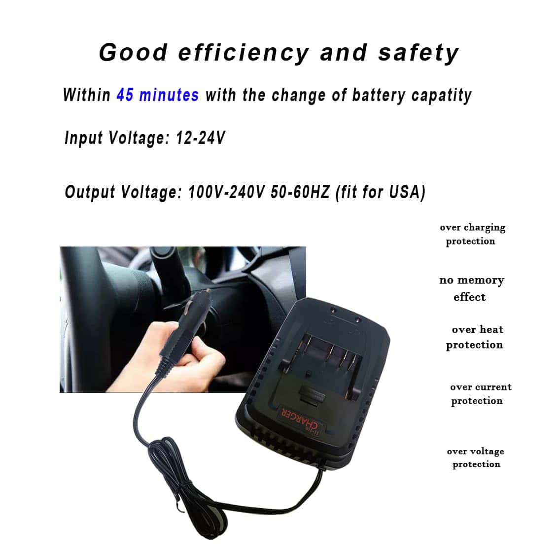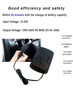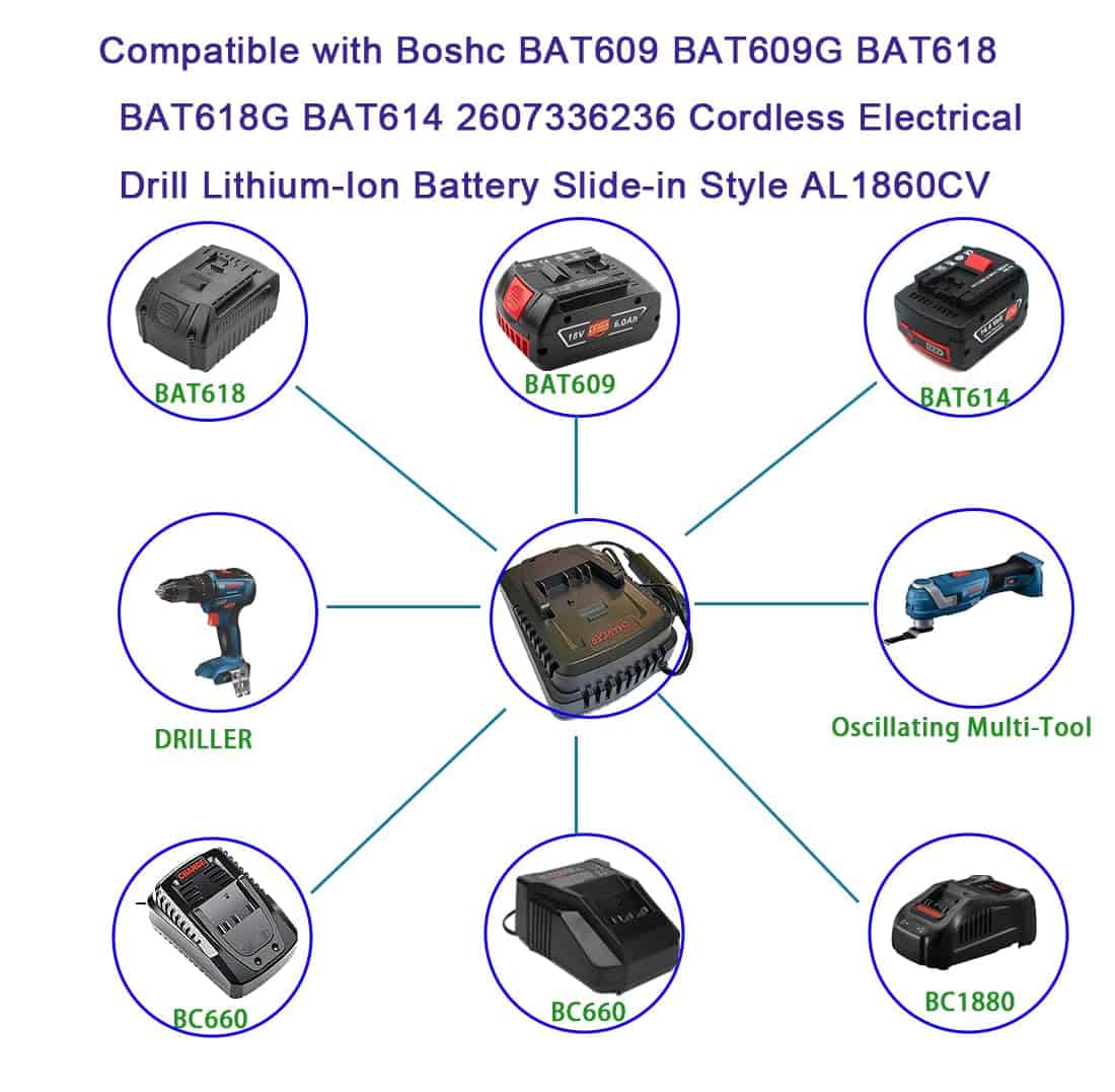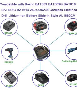 6. Seguro y ConfiablenLa función de apagado automático protege la descarga excesiva de la batería del vehículon. Modelo de Batería Compatible: BAT619, 2607336169, BAT609G, 2607336092, 2607336236, BAT619G, 2607336170, 2607336235, 2607336091, BAT609, BAT618, BAT618G, BAT610G. Compatible con modelos Bosch: GBH 18V-LI, GBH 18 VH, 17618, 17618-01, 24618-01, 25618, 25618-01, 25618-02, 26618, 26618-01, 3601H61S10, 36618-02, 37618, 37618-01, GSB 18V-LIN, GSB 18VE-2-LI, GSB 18-2-LI, GSK 18V-LI, GSR 18V-LI, GSR 18V-LIN, GSR 18VE-2-LI, GSR 18-2-LI, GST 18V-LI, GWS 18V-LI, BSH180, CAG180-01, CCS180, CCS180B, CCS180K, CFL180, CFL180B, CRS180, CRS180B, CRS180K, DDS180-01, DDS180-03, DGSH-181, FHN180, HDS180-03, HTH181-01. Compatible con el modelo de cargador: Compatible con los cargadores Bosch BC660 BC1880 BC630 1018K. Sistema de protección inteligente: 1. Se detiene automáticamente la carga en caso de sobre carga. 2. Se corta automáticamente en caso de cortocircuito. 3. Se detiene automáticamente la carga cuando se detecta una falla en el cargador. 4. No se carga una batería defectuosa. 5. Se detiene la carga en caso de sobrecalentamiento.