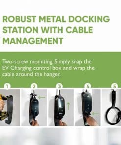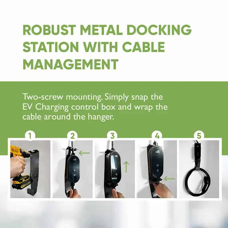 4. CARGA ORGANIZADA: Un sistema inteligente de gestión de cables mantiene ordenada su área de carga. La cubierta impermeable del cabezal del cargador y el cable reforzado aseguran la durabilidad en cualquier clima. También incluye un colgador de cable, un estuche resistente y una cubierta resistente a la intemperie para mantener protegido su equipo en interiores o exteriores.