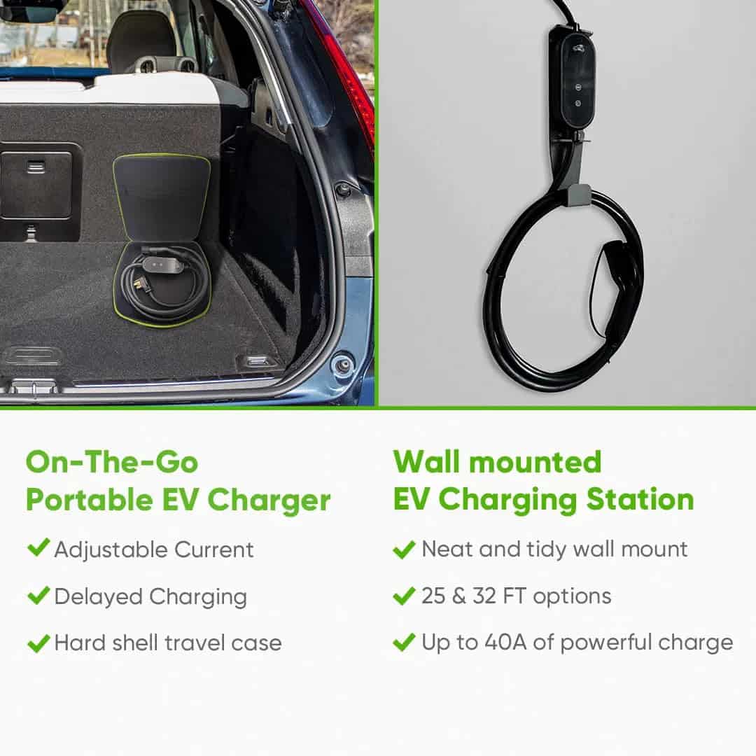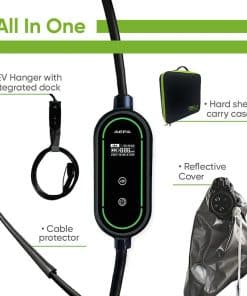 2. COMPACTO Y PORTÁTIL: Este cargador de vehículo eléctrico Nivel 2 viene con un cable de 25 pies que garantiza accesibilidad en varias ubicaciones, desde garajes hasta espacios de estacionamiento al aire libre. Su diseño ligero y compacto de 7.5 pulgadas, junto con un colgador de cable y un estuche resistente, asegura un fácil almacenamiento y transporte para los propietarios de vehículos eléctricos en movimiento.