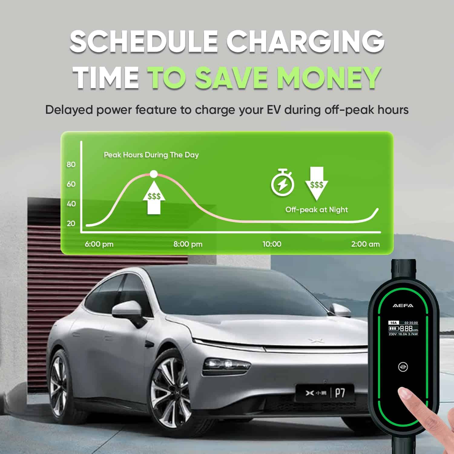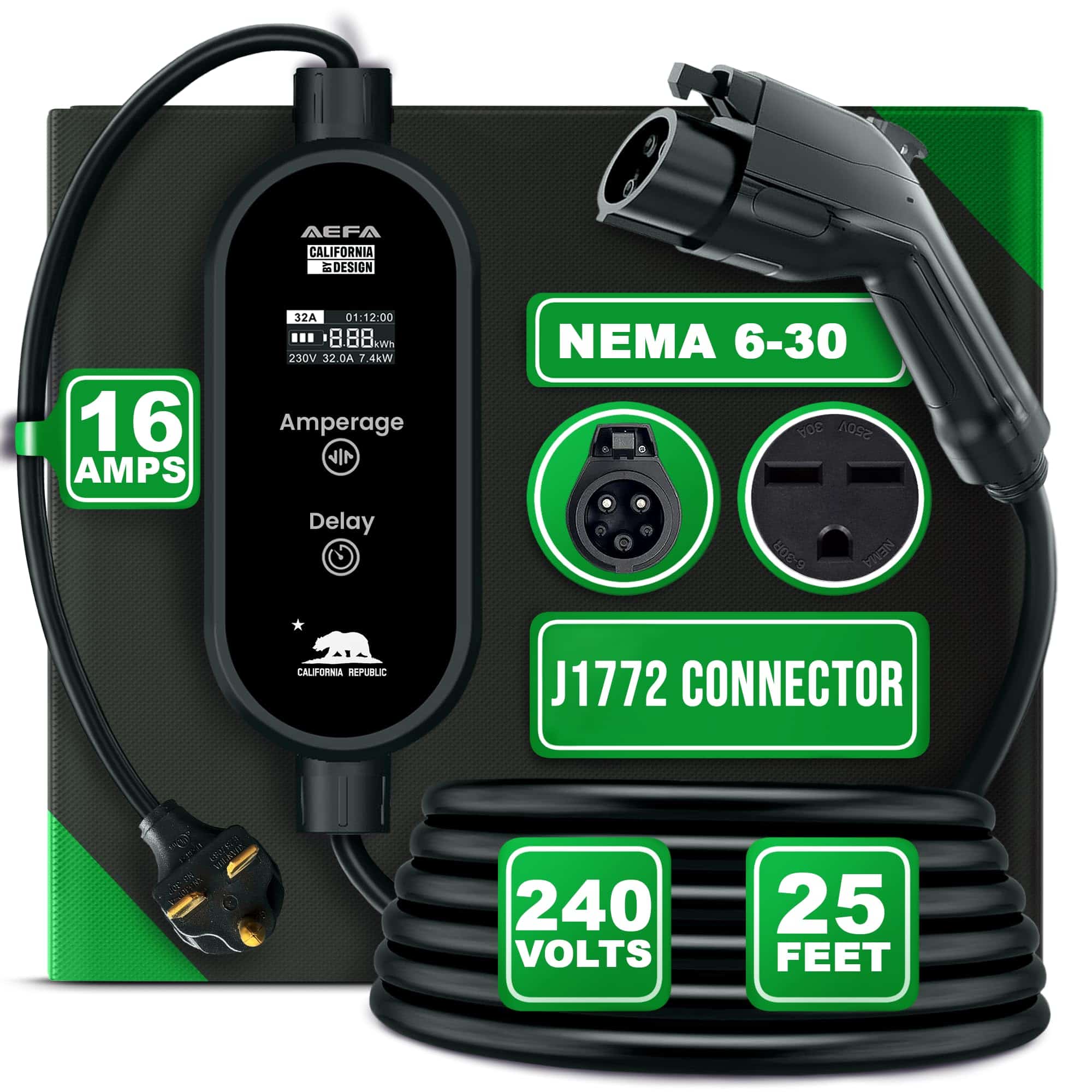 1. CARGADOR DE VEHÍCULO ELÉCTRICO AJUSTABLE: El cargador AEFA Nivel 2 NEMA 6-30 proporciona hasta 16 amperios de potencia ajustable, permitiendo velocidades de carga de hasta 12 millas por hora. Incorpora un temporizador de encendido retardado para programar la carga durante las horas no pico, reduciendo los costos de electricidad mientras asegura que su vehículo eléctrico esté listo cuando sea necesario.