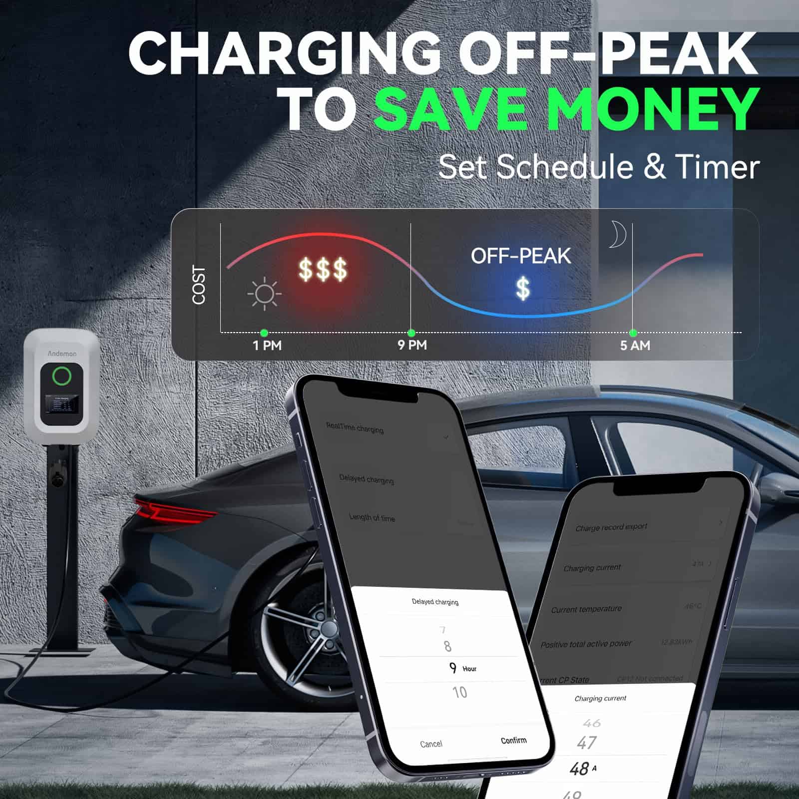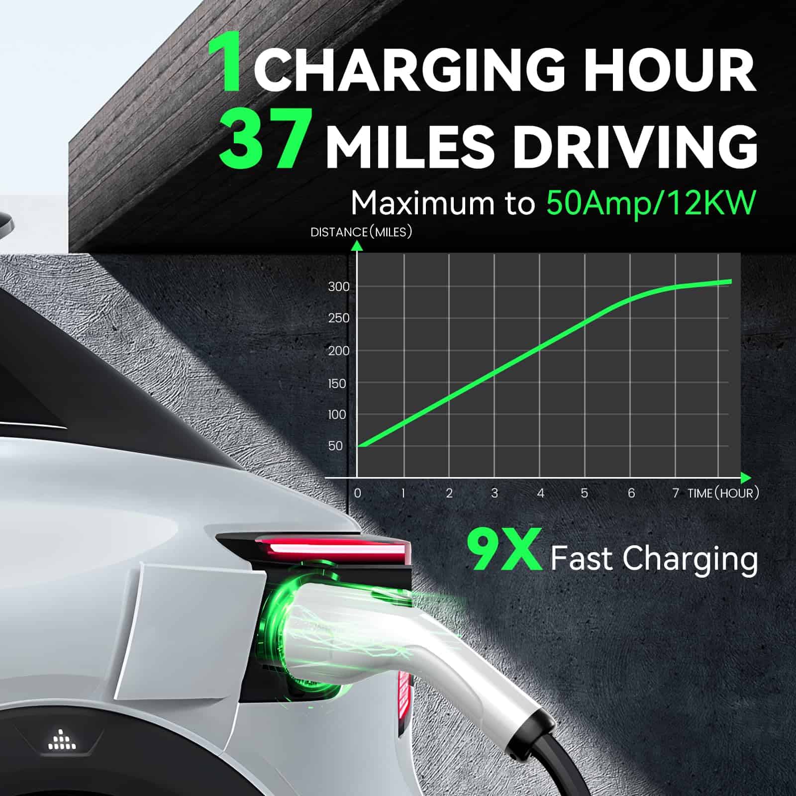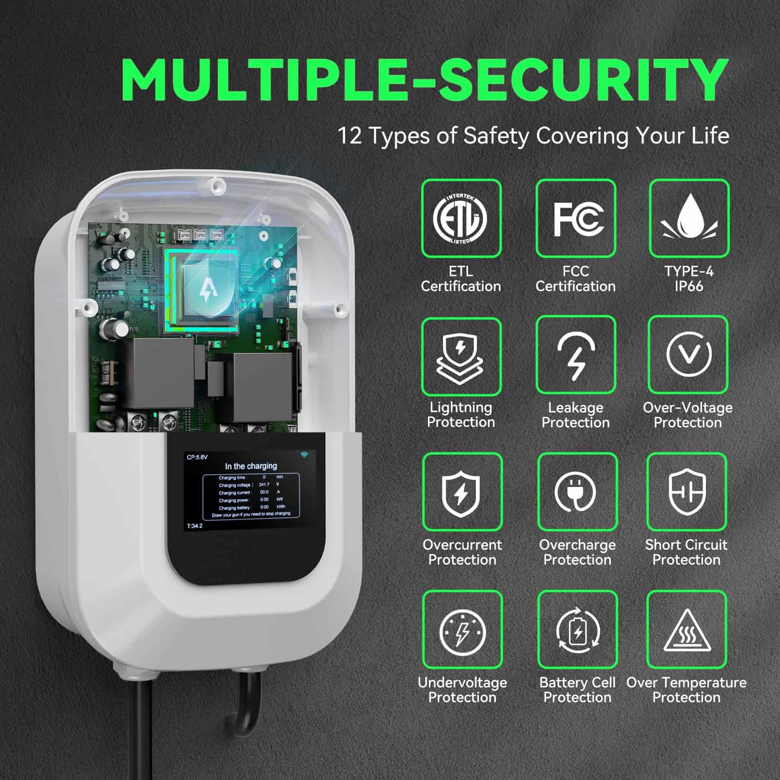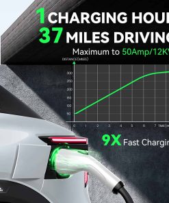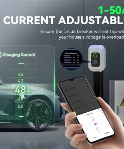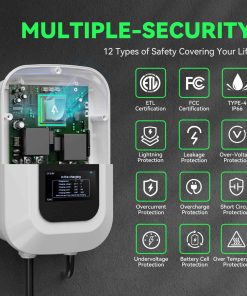 Cargador de estación de carga para vehículos eléctricos de alto rendimiento. Ofrece una carga rápida hasta 9 veces más rápida que un cargador convencional. Capacidad de 12kW y 50A, con ajuste de corriente personalizable. Compatible con todos los modelos de vehículos eléctricos gracias al enchufe SAE J1772. Certificaciones ETL y Energy Star para garantizar la seguridad y fiabilidad del producto. Protección contra condiciones adversas como sobrecalentamiento, altas temperaturas, lluvia, nieve y bajos temperaturas. Control avanzado a través de la aplicación inteligente para gestión remota, programación y seguimiento en tiempo real. Pantalla LCD para seguimiento de carga y seguridad mejorada con RFID para evitar robos y garantizar una carga segura en cualquier entorno.
