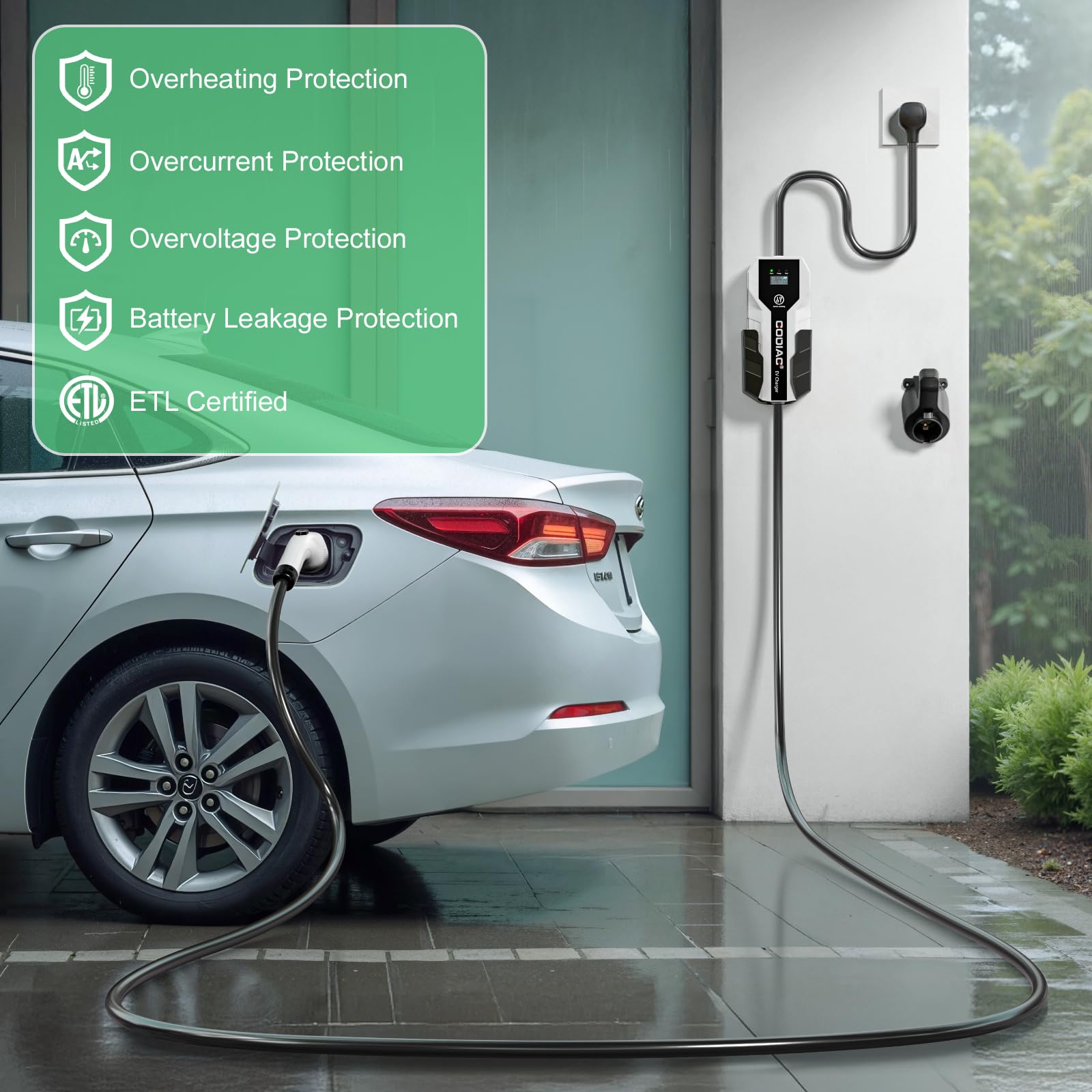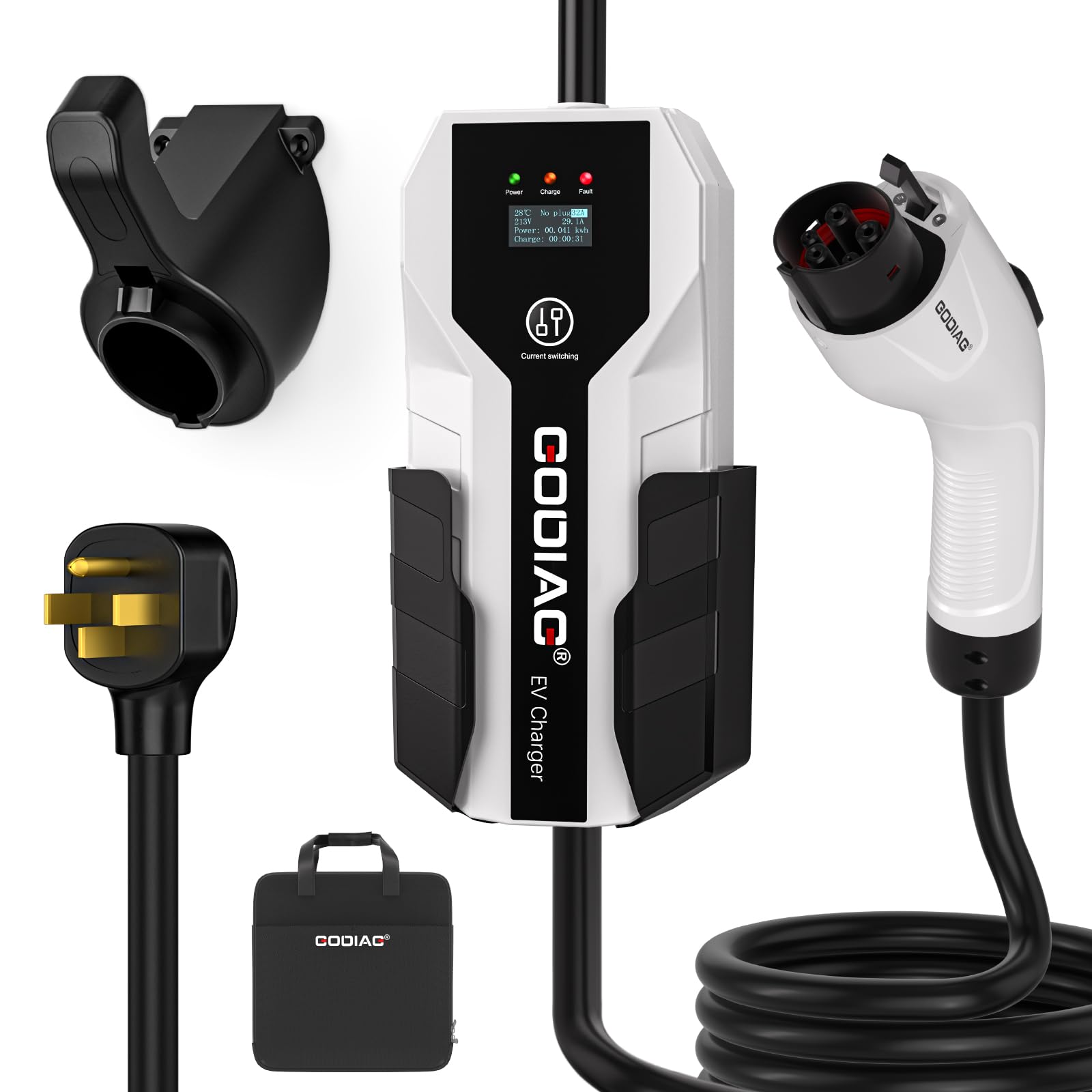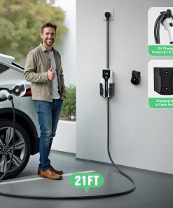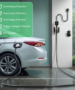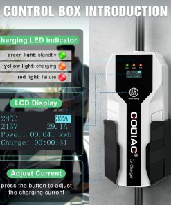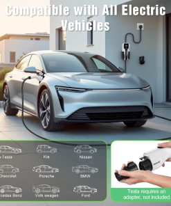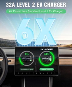 Cargador portátil diseñado para EVs y PHEVs estándar J1772, propietarios de Tesla necesitan un adaptador J1772 a Tesla (no incluido). Certificado internacionalmente por ETL y FCC; funciones de protección inteligente contra sobretensión, sobreintensidad y cortocircuito incorporadas. Resistente al polvo y al agua IP65, solo conéctalo y listo. Pantalla LCD informativa para monitorear el modo de carga seleccionado, la tensión y corriente de carga, la temperatura, los kWh completados y la duración de la carga. Incluye: 1x cargador EV Nivel 2 de 32 amperios, 1x soporte para caja de carga, 1x soporte para cable, 1x bolsa de almacenamiento, 1x manual de usuario, 1x juego de tornillos de montaje, garantía de 12 meses.