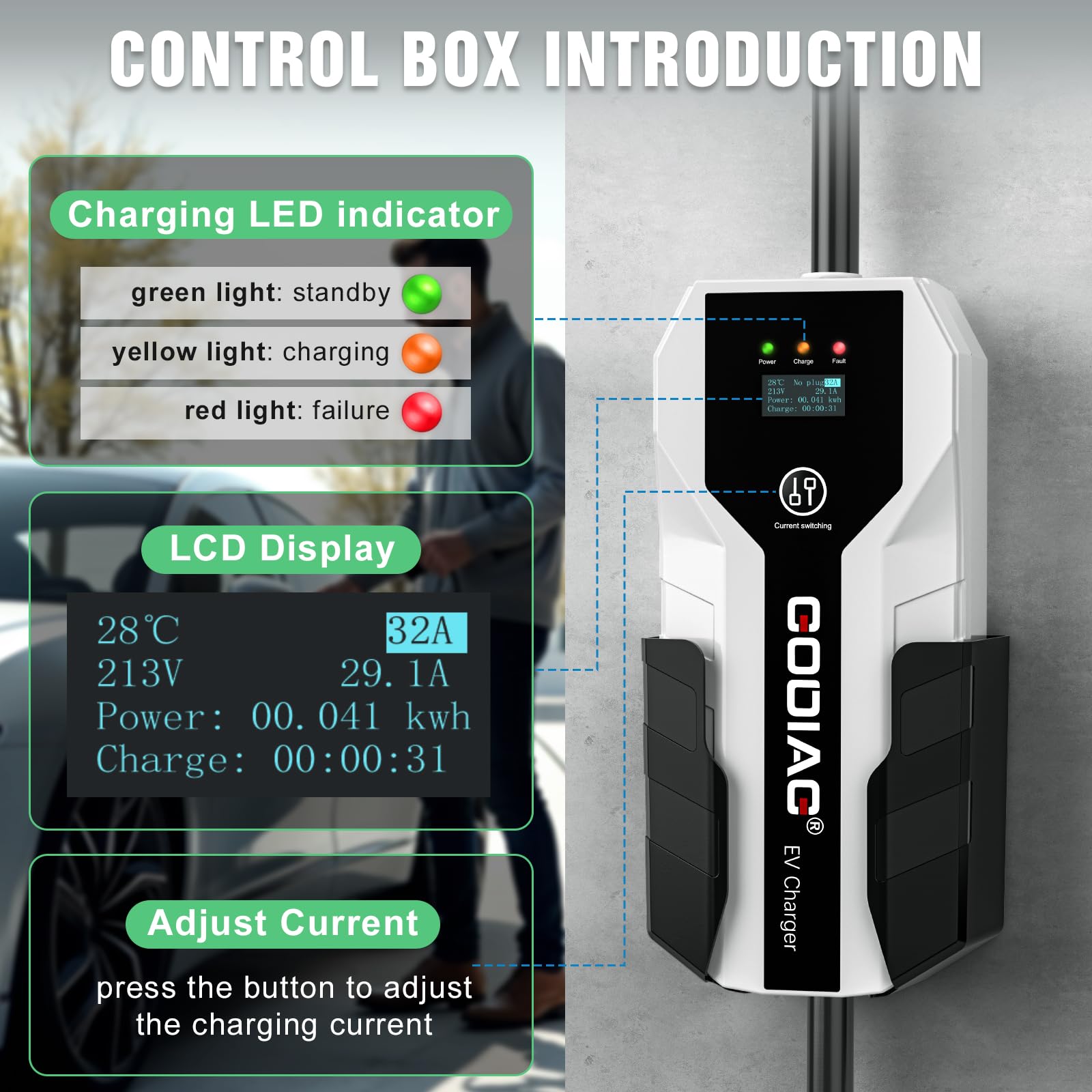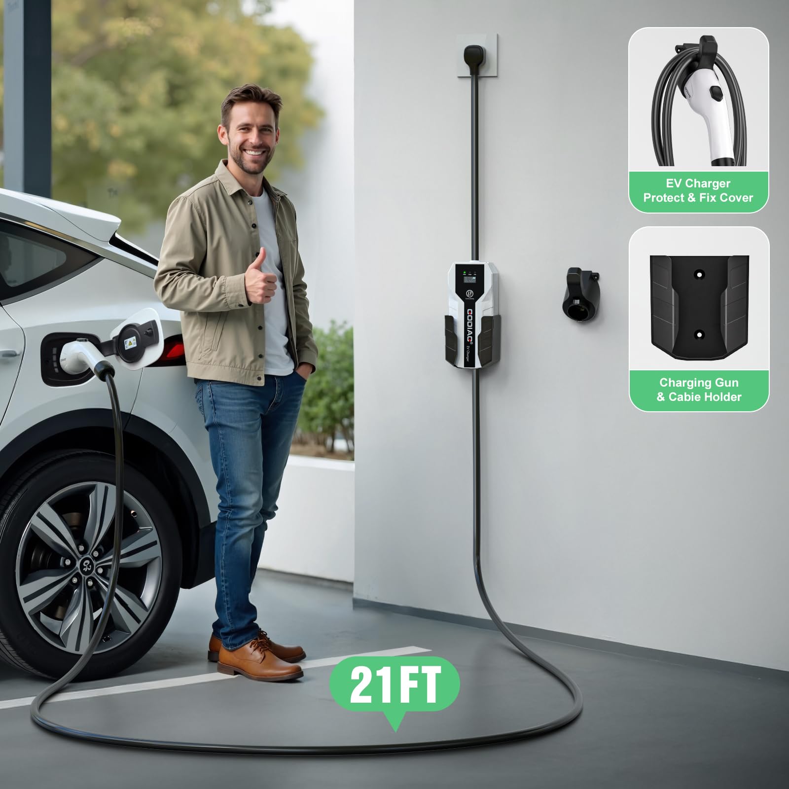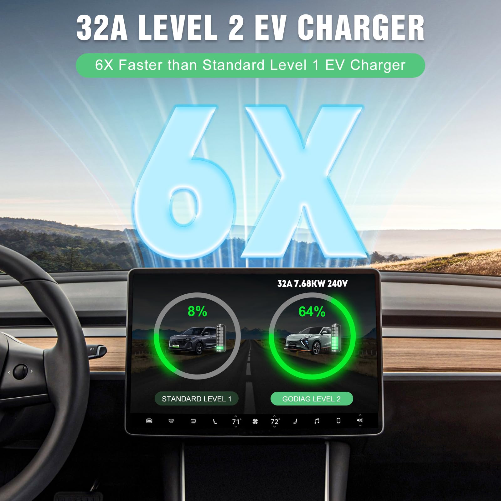 Cargador portátil diseñado para EVs y PHEVs estándar J1772, propietarios de Tesla necesitan un adaptador J1772 a Tesla (no incluido). Certificado internacionalmente por ETL y FCC; funciones de protección inteligente contra sobretensión, sobreintensidad y cortocircuito incorporadas. Resistente al polvo y al agua IP65, solo conéctalo y listo. Pantalla LCD informativa para monitorear el modo de carga seleccionado, la tensión y corriente de carga, la temperatura, los kWh completados y la duración de la carga. Incluye: 1x cargador EV Nivel 2 de 32 amperios, 1x soporte para caja de carga, 1x soporte para cable, 1x bolsa de almacenamiento, 1x manual de usuario, 1x juego de tornillos de montaje, garantía de 12 meses.