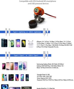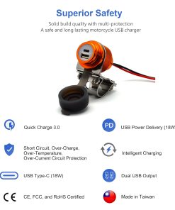 Cargador USB para motocicleta resistente al agua de Cliff Top, con doble puerto USB y carga rápida de 36W PD USB-C y QC 3.0, ideal para cargar tu teléfono mientras conduces tu motocicleta. Fabricado con materiales reciclables y no tóxicos, este cargador es ecológico y seguro para el uso. Incluye un soporte universal para montaje en manillar de 7/8″ y 1″, con un cable de 1.2 metros para una instalación fácil. Equipado con un interruptor magnético de encendido y apagado, este cargador ayuda a prevenir la descarga de la batería y protege los puertos de agua, polvo y escombros. Ofrece una carga rápida con un puerto USB-C de 18W y un puerto USB-A de 18W, proporcionando un total de 36W de potencia. Cada puerto se alimenta de forma independiente a 18W, asegurando un rendimiento óptimo al cargar dos dispositivos simultáneamente. El sistema de detección de corriente inteligente ajusta la salida de acuerdo a los dispositivos conectados, previniendo sobrecargas y protegiendo las baterías. Construido con aluminio anodizado y certificaciones de seguridad, este cargador incluye protección contra sobrecargas, sobrecalentamientos y corrientes excesivas. Respaldado por una garantía de 12 meses y soporte de por vida, y con una garantía de satisfacción de 30 días. Disfruta de una carga rápida y segura mientras conduces tu motocicleta con el cargador USB de Cliff Top.