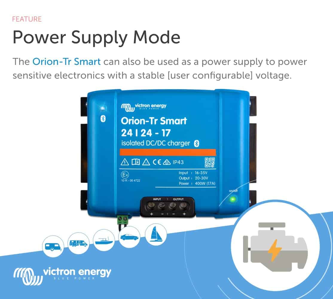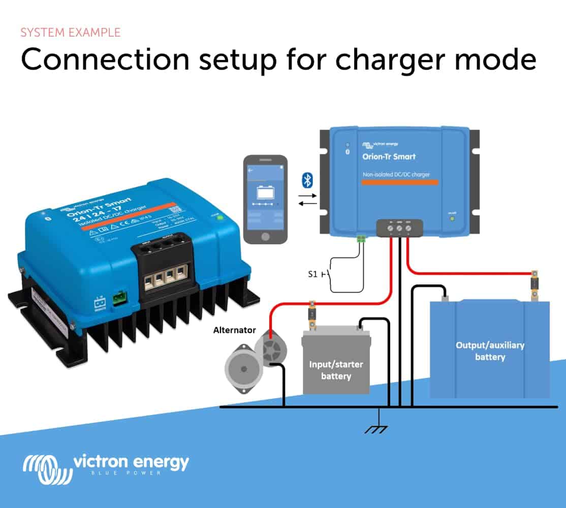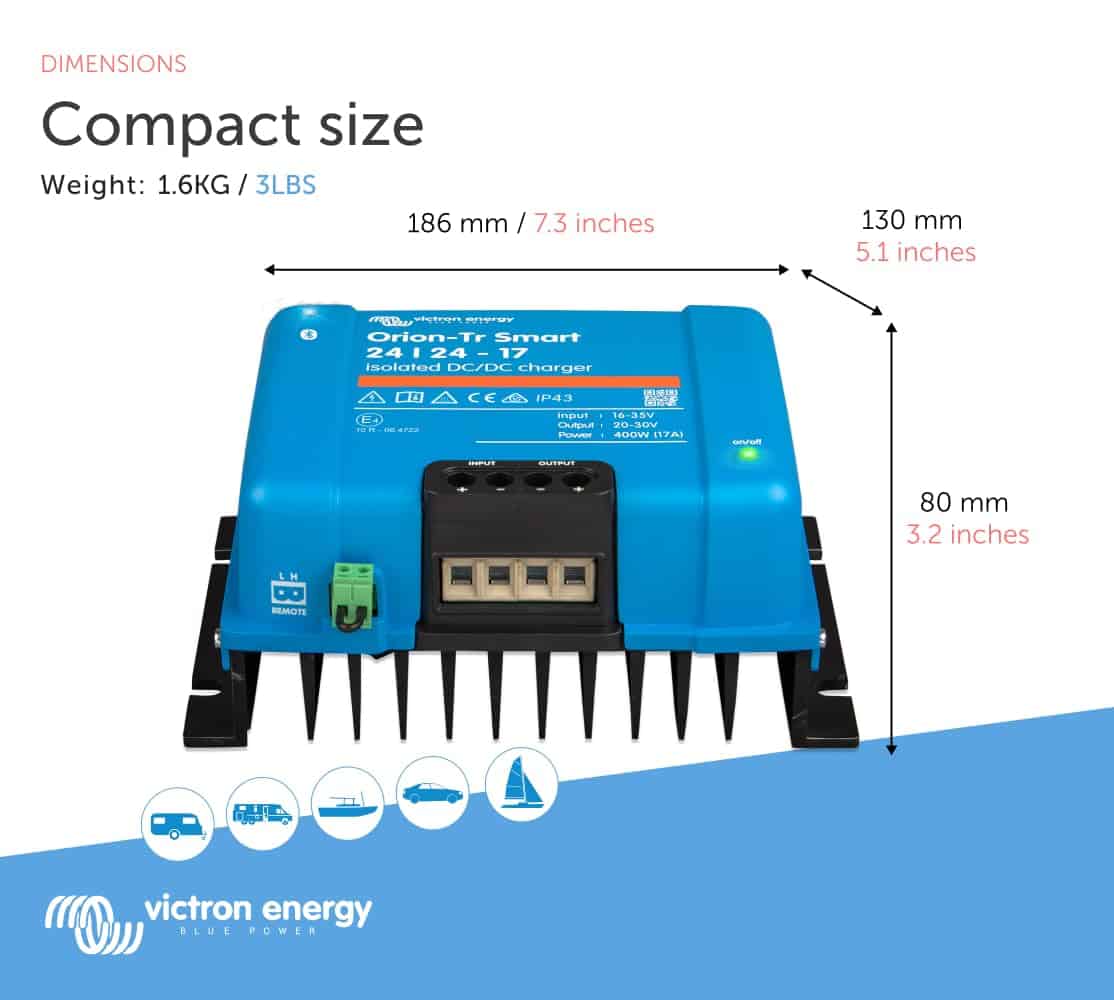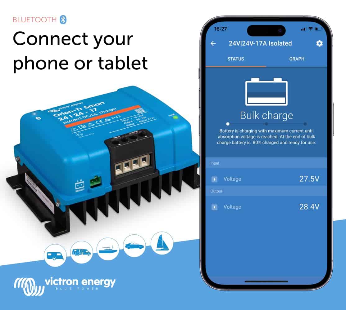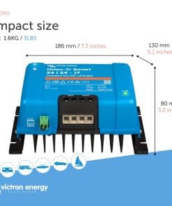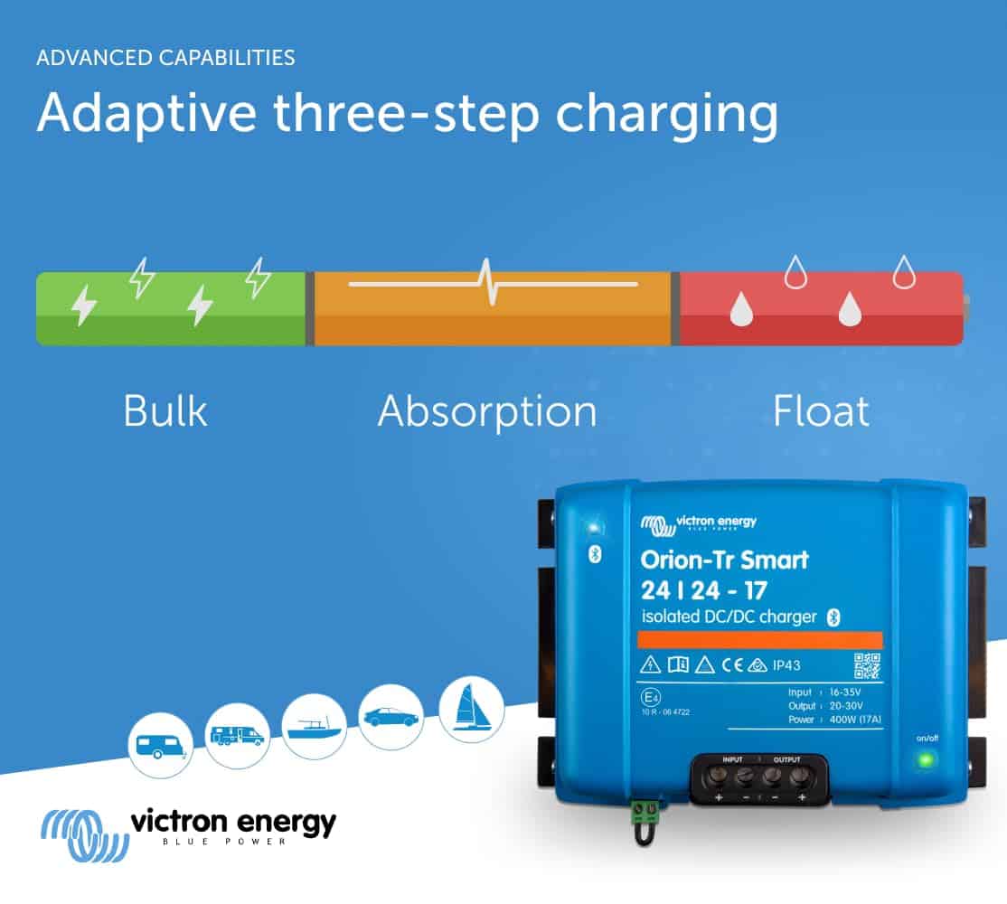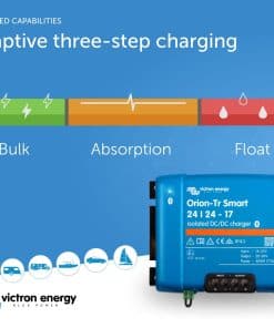 El cargador Orion-Tr Smart DC-DC es un cargador profesional DC a DC adaptativo de 3 etapas con Bluetooth integrado. Para uso en sistemas de batería dual en vehículos o en embarcaciones donde el alternador (inteligente) y la batería de arranque se utilizan para cargar la batería de servicio. La unidad se puede monitorear y programar a través de Bluetooth y se puede controlar de forma remota a través de un interruptor de encendido / apagado remoto y tiene un mecanismo de detección de motor en funcionamiento. El cargador Orion Tr-Smart se puede usar en sistemas de 12V o 24V y es adecuado para baterías de plomo y litio. Los modelos están disponibles hasta 400W y se pueden conectar unidades múltiples ilimitadas en paralelo para aumentar la potencia de salida. Adecuado para altas temperaturas de hasta 55 C con una potencia nominal completa de hasta 40 C.