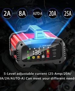 2. 5 Niveles de Corriente Ajustable, Ahorrándote Tiempo y Dinero El cargador de batería para automóvil admite ajuste de corriente de carga y tiene un rango de carga más amplio. Puede seleccionar manualmente 5 modos de carga: 2a, 8a, automático, 20a y 25a. Puede elegir la corriente para cada batería que sea más adecuada para ella, prolongando la vida útil de la batería y ahorrándote dinero al mismo tiempo.